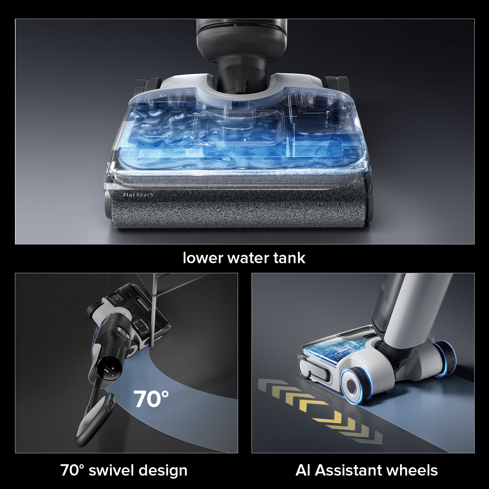 Enhanced with a low water tank and 70° swivel design, it lets you glide effortlessly around furniture and obstacles, delivering a smoother, more efficient clean.