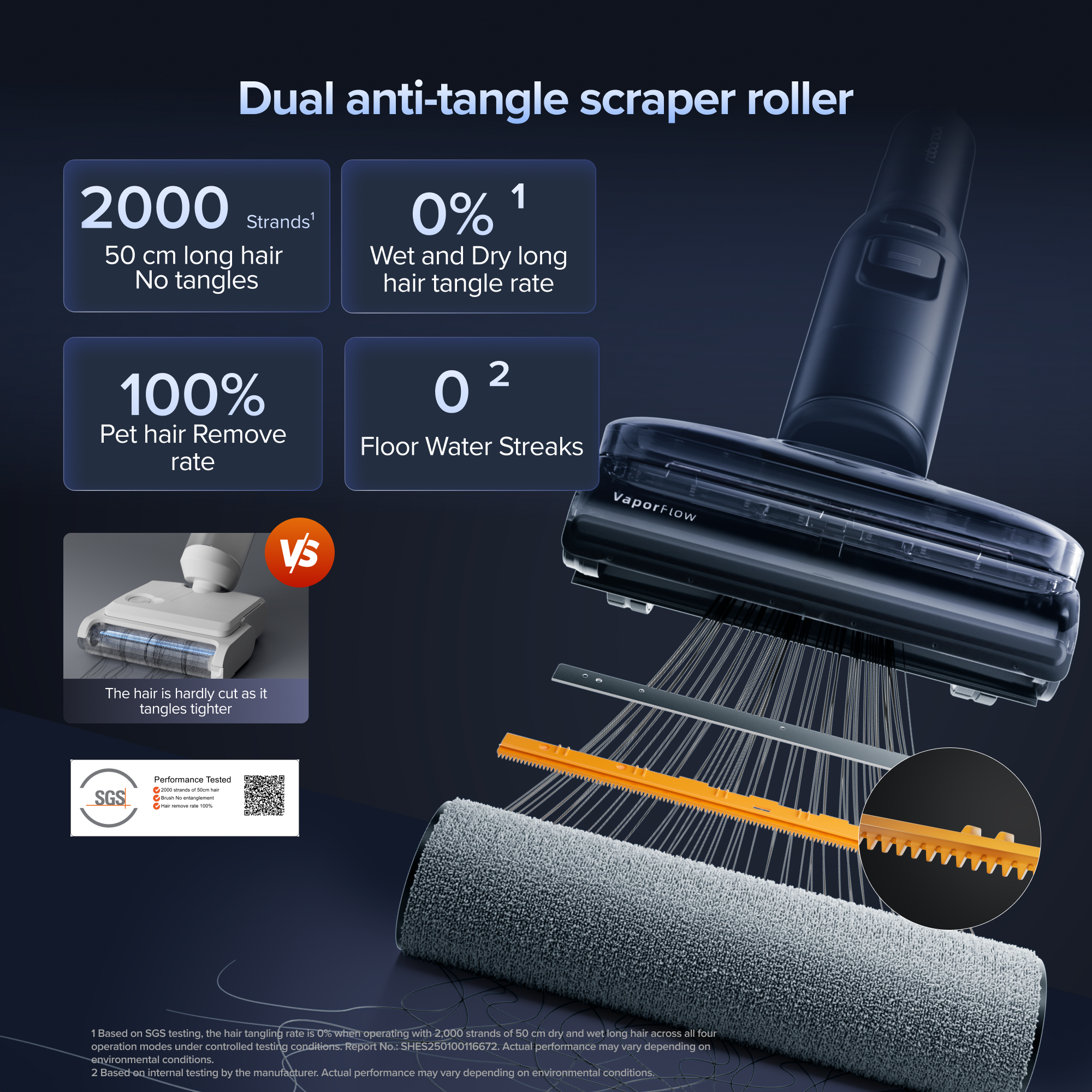 Achieve flawless, water-streak-free8 floors with the dual anti-tangle scraper roller—featuring a constant-pressure scraper to prevent watermarks and shark-tooth blades that capture hair for capture hair for a smooth, tangle-free9 finish.