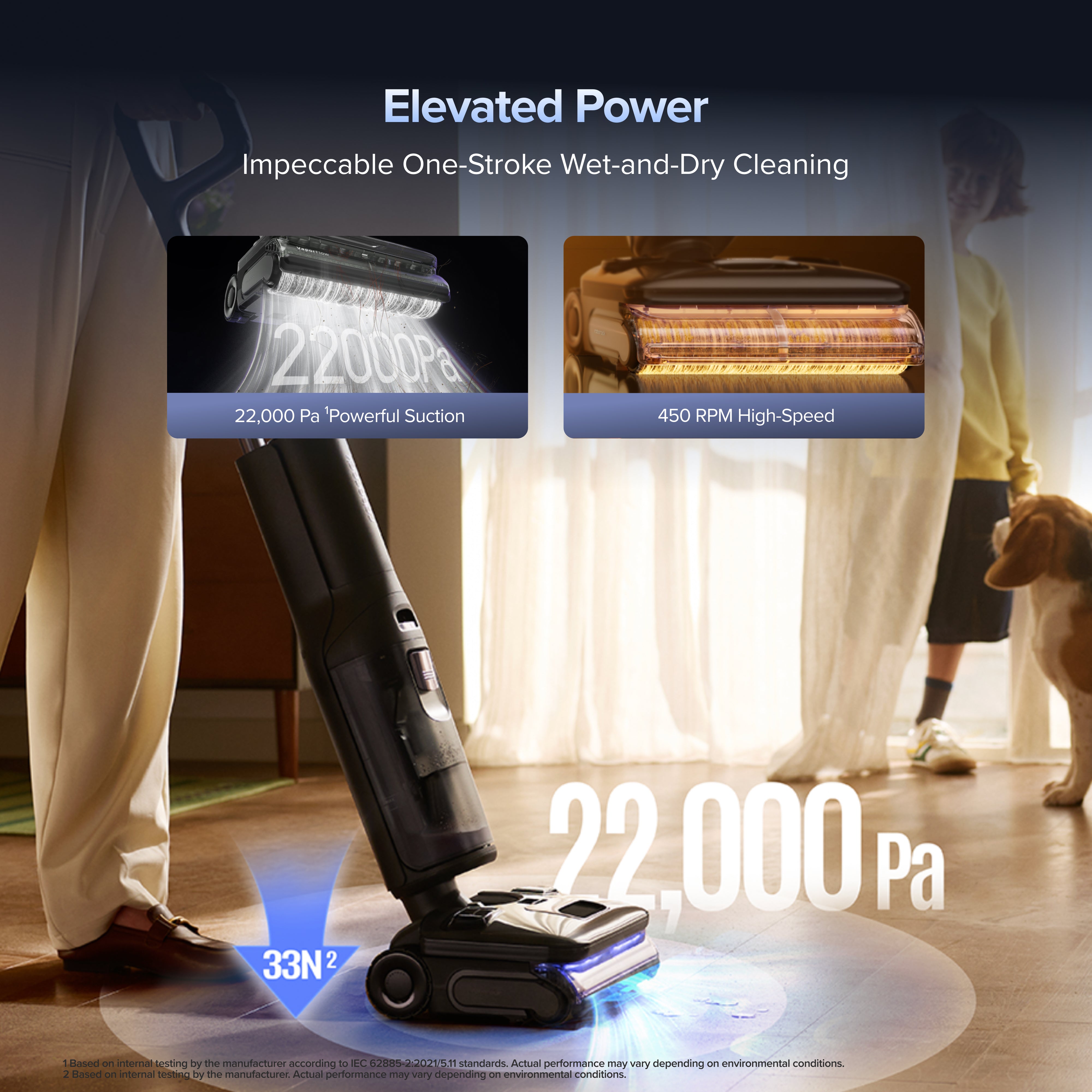 22,000 Pa hurricane suction paired with a 450 RPM high-speed roller brush tackles both wet and dry messes effortlessly. When the water tank is full, the brush head applies an extra 33 N of downward pressure, keeping the roller closer to the floor, increasing friction, and effectively breaking down stubborn stains for superior cleaning efficiency.