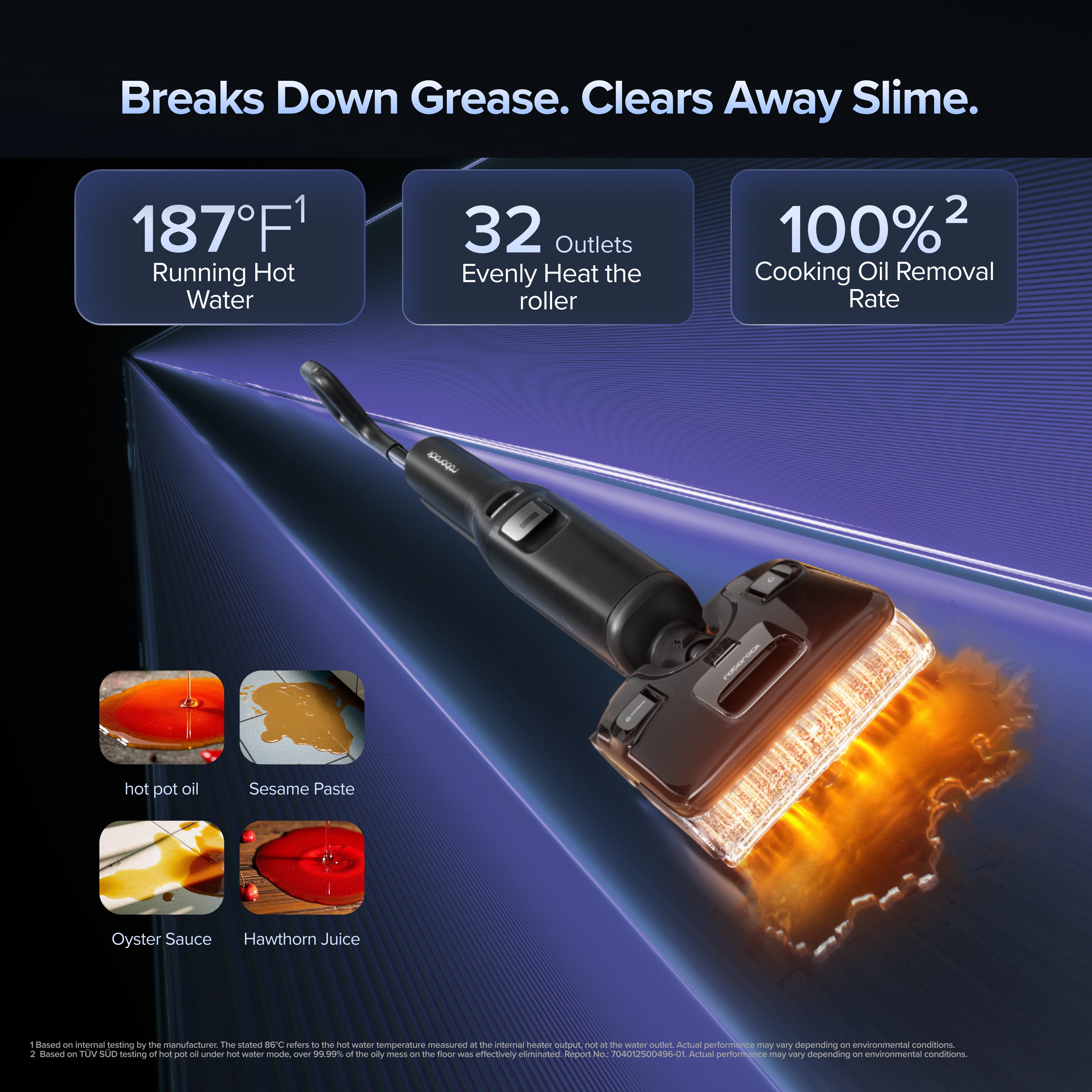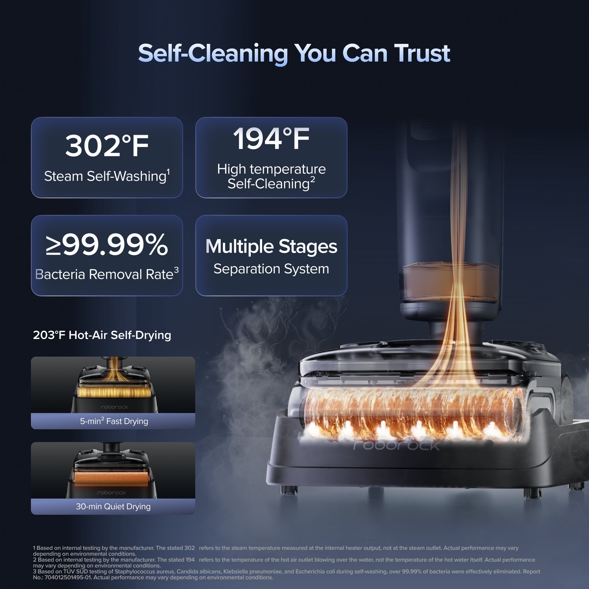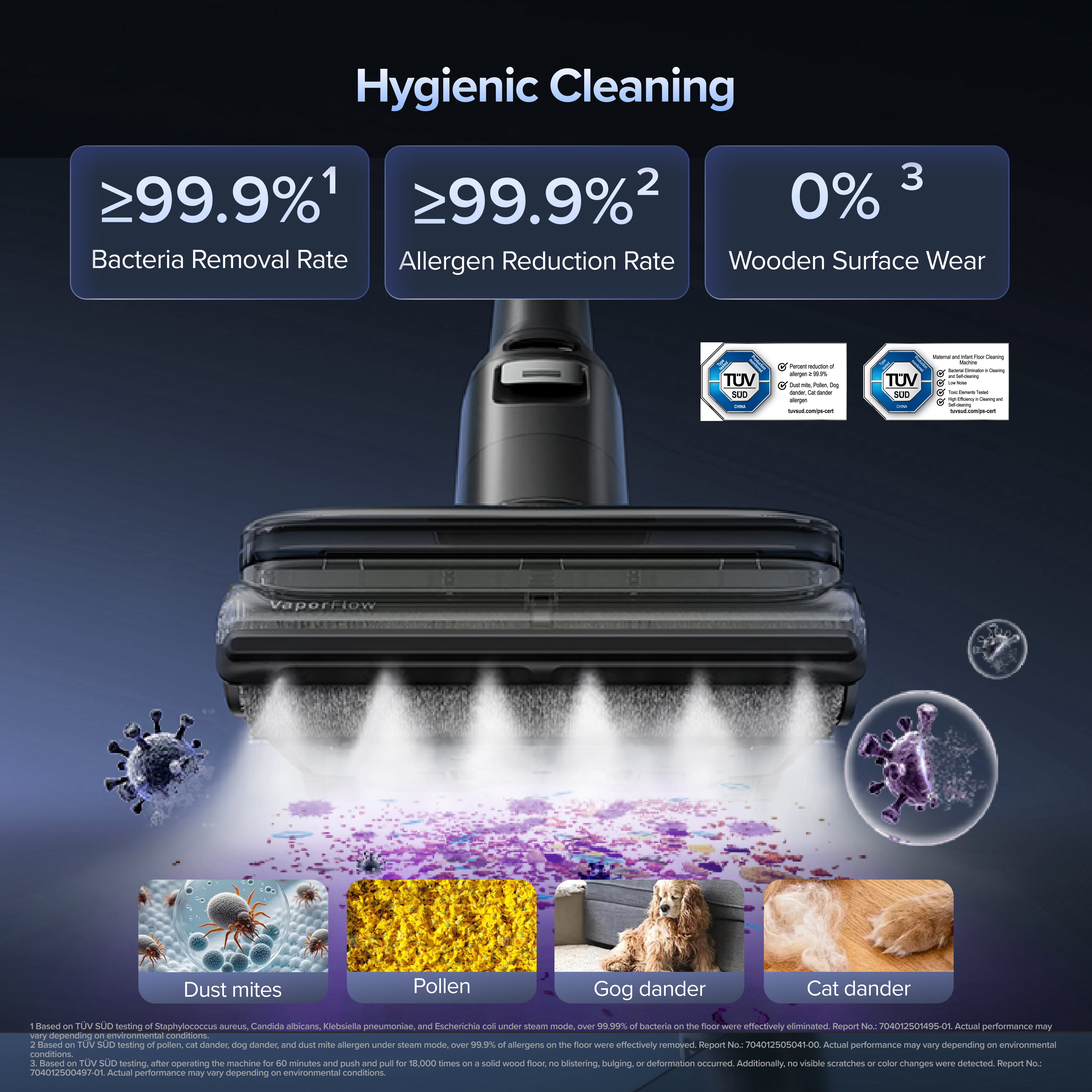 [3] Based on TÜV SÜD testing of Staphylococcus aureus, Candida albicans, Klebsiella pneumoniae, and Escherichia coli under steam mode, over 99.99% of bacteria on the floor were effectively eliminated. Report No.: 704012501495-01. Actual performance may vary depending on environmental conditions.Based on TÜV SÜD testing of pollen, cat dander, dog dander, and dust mite allergen under steam mode, over 99.9% of allergens on the floor were effectively removed. Report No.: 704012505041-00. Actual performance may vary depending on environmental conditions.