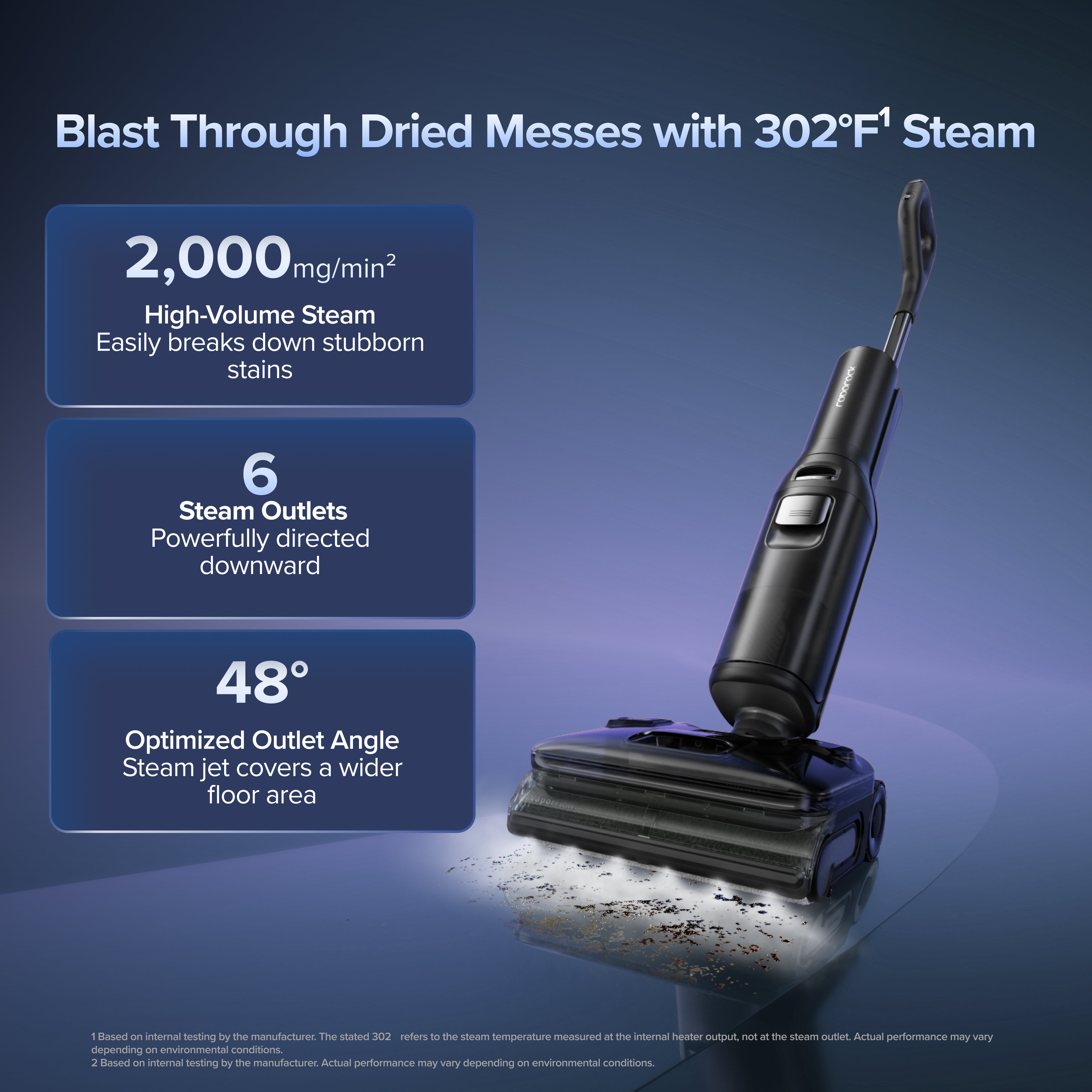 Tackle dried-on messes and stubborn stains with 302 ℉ steam1 sprayed across the full cleaning width — no chemicals needed. With a steam flow rate of 2,000 mg/min2, it powerfully breaks down stains for deeper cleaning, while the 48° optimized outlet angle ensures the steam jet covers a wider floor area.