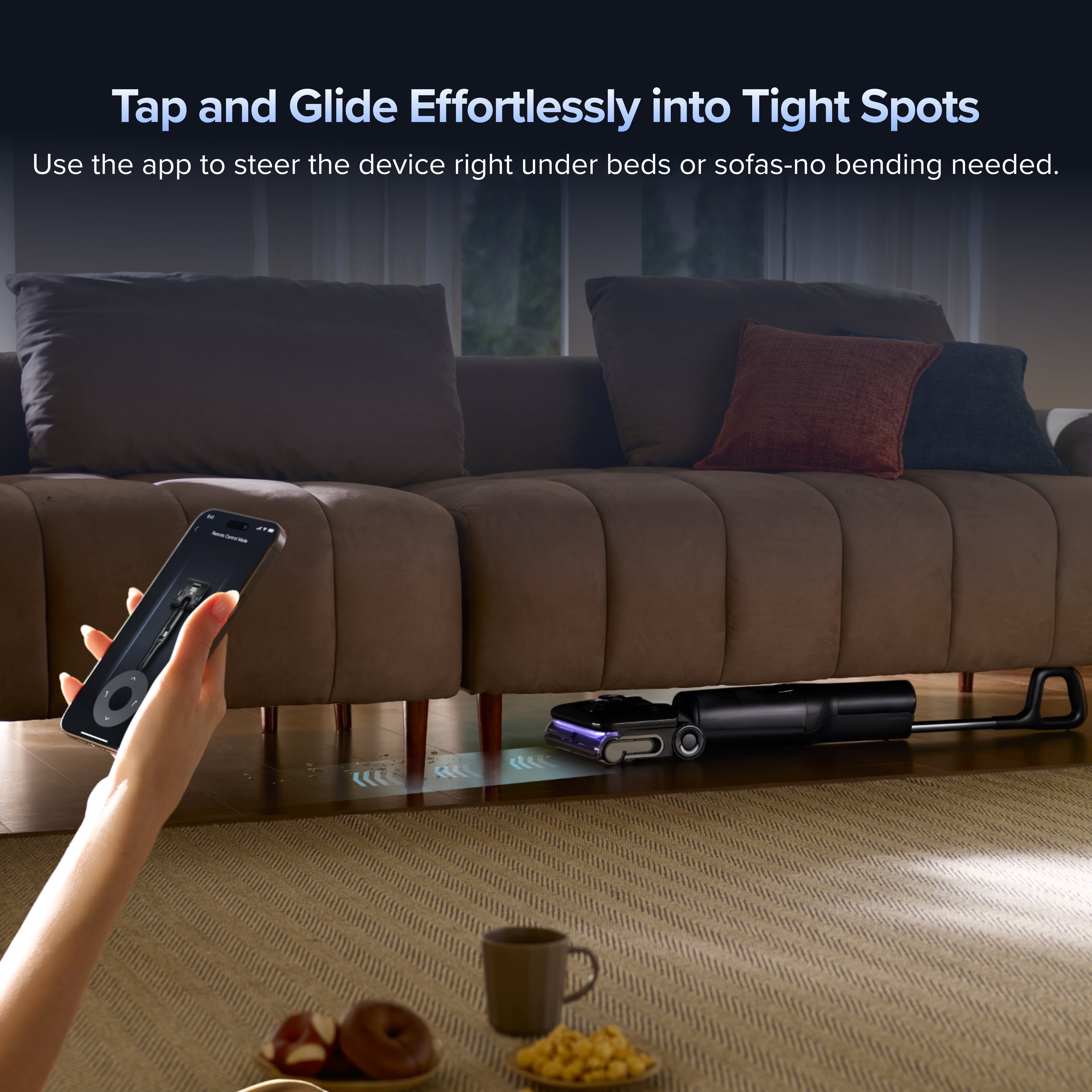 Use the app to steer the device easily under beds and sofas—forward, backward, and even sideways—without bending.