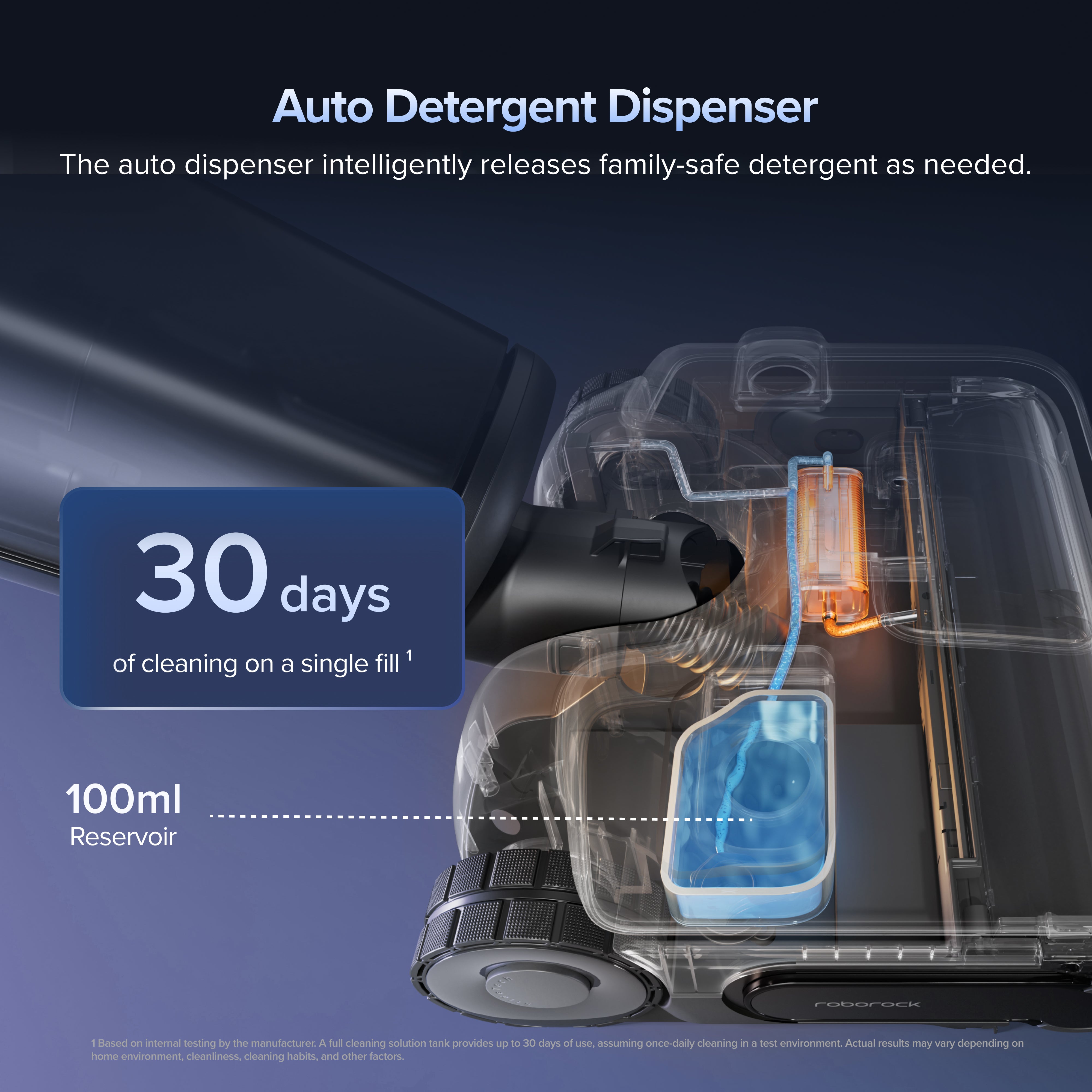 [6]Based on internal testing by the manufacturer. A full cleaning solution tank provides up to 30 days of use, assuming once-daily cleaning in a test environment. Actual results may vary depending on home environment, cleanliness, cleaning habits, and other factors.