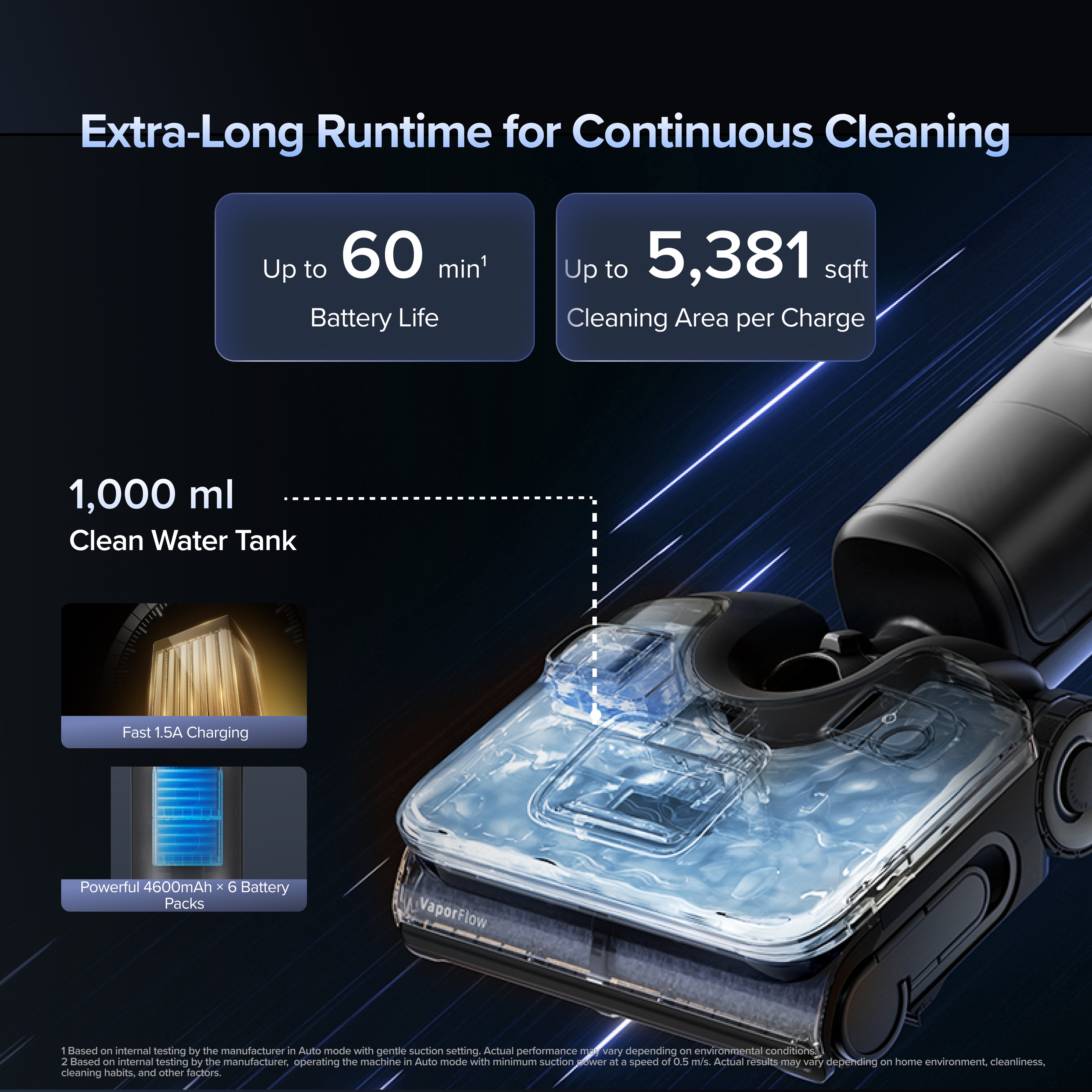 [14]Based on internal testing by the manufacturer, operating the machine in Auto mode with minimum suction power at a speed of 0.5 m/s. Actual results may vary depending on home environment, cleanliness, cleaning habits, and other factors.