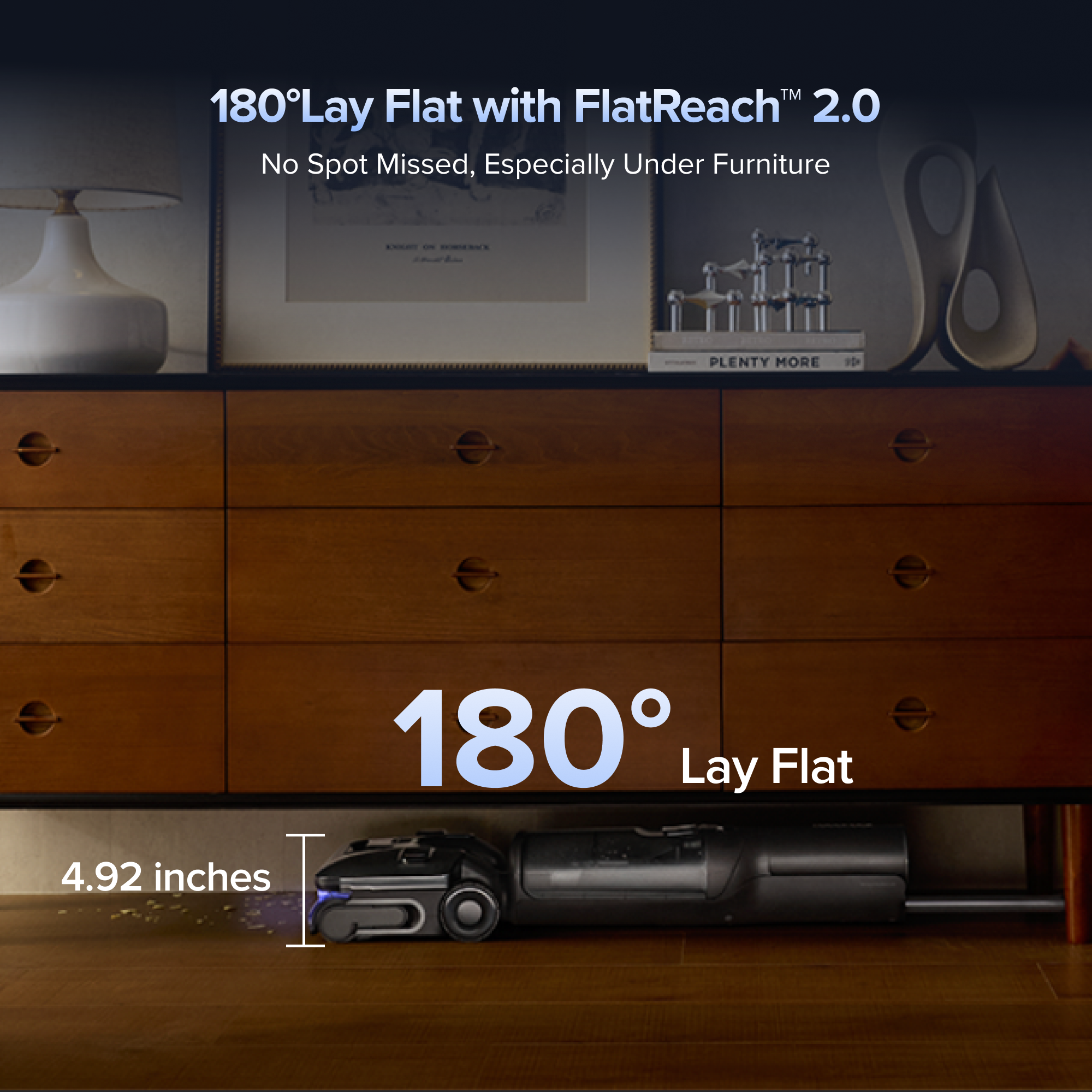 Power through tight spaces with a slim 4.92 inches flat design that maintains full suction at 180°. Its ultra-low profile reaches every corner, leaving no dust behind.