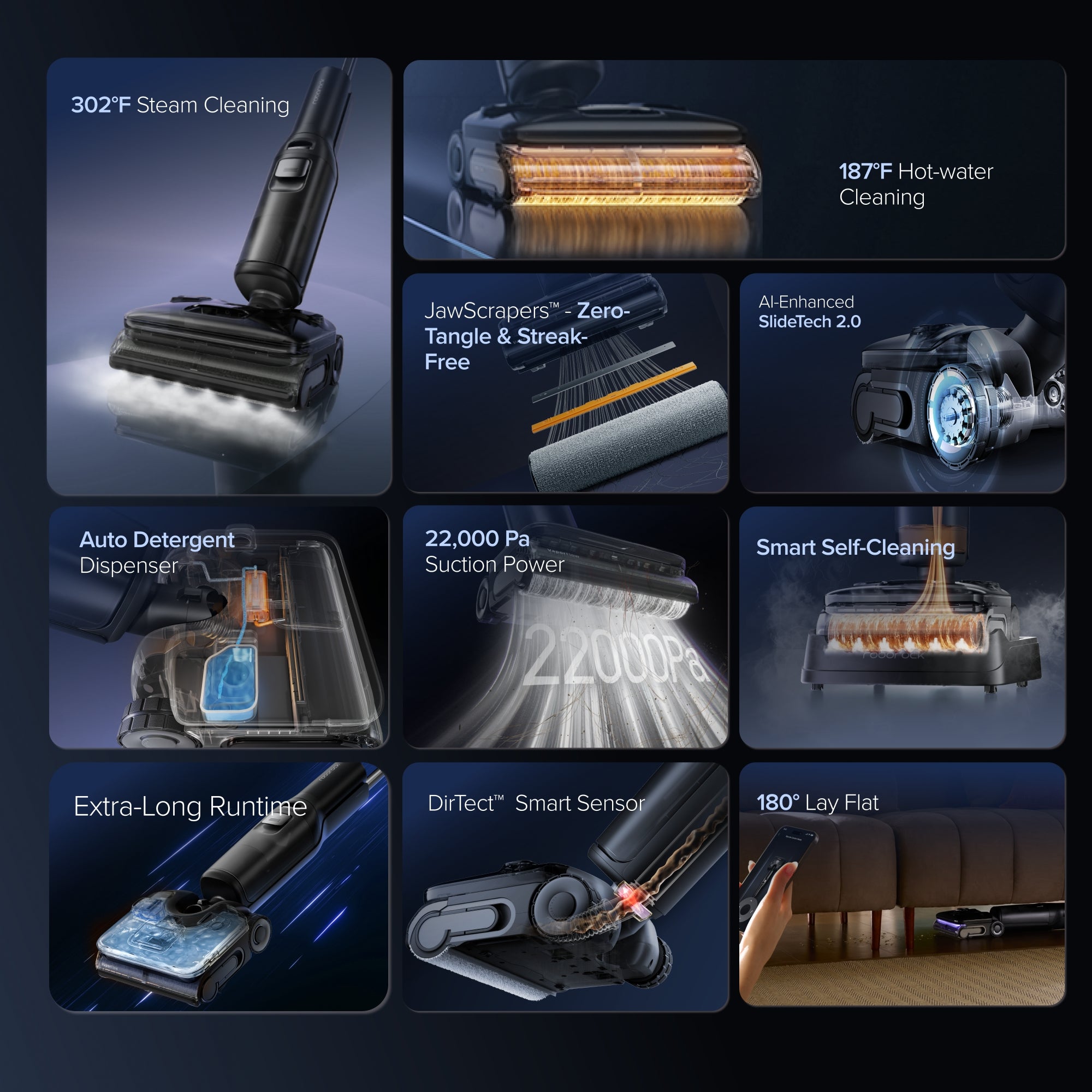 •Using 302 ℉ steam10 and 194 ℉ hot water11 to deep-clean the roller with advanced solid-liquid-air separation technology, while the DirTect™ module senses dirt levels and automatically adjusts the cleaning power—keeping the roller fresh and spotless.