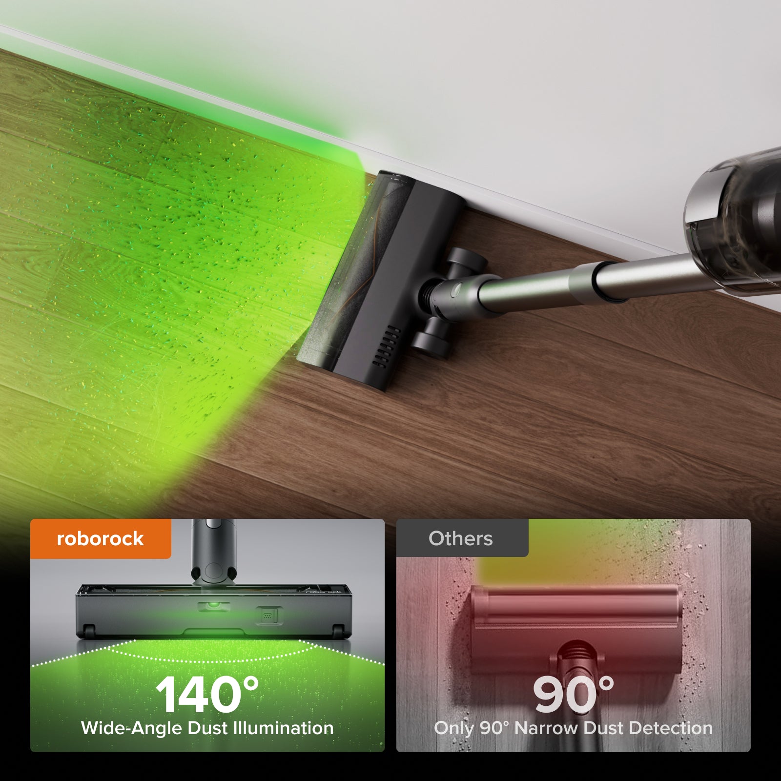 A powerful green light reveals invisible dust and fine particles. Its 140° ultra-wide angle and central alignment ensure maximum floor coverage for a deeper clean.