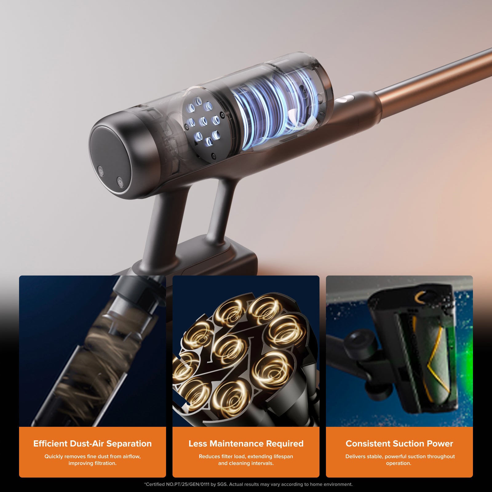 The advanced 9-cyclone system effectively separates dust from air, preventing filter clogging and maintaining powerful, consistent suction.