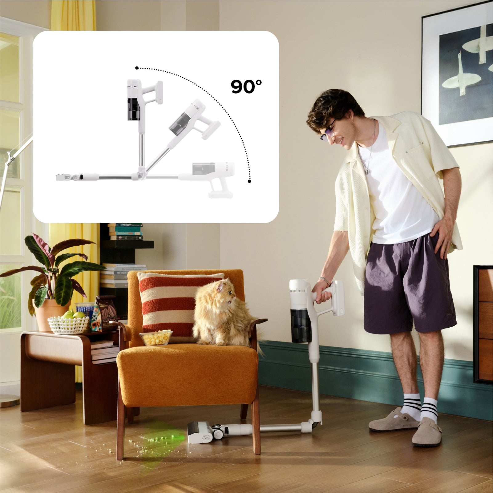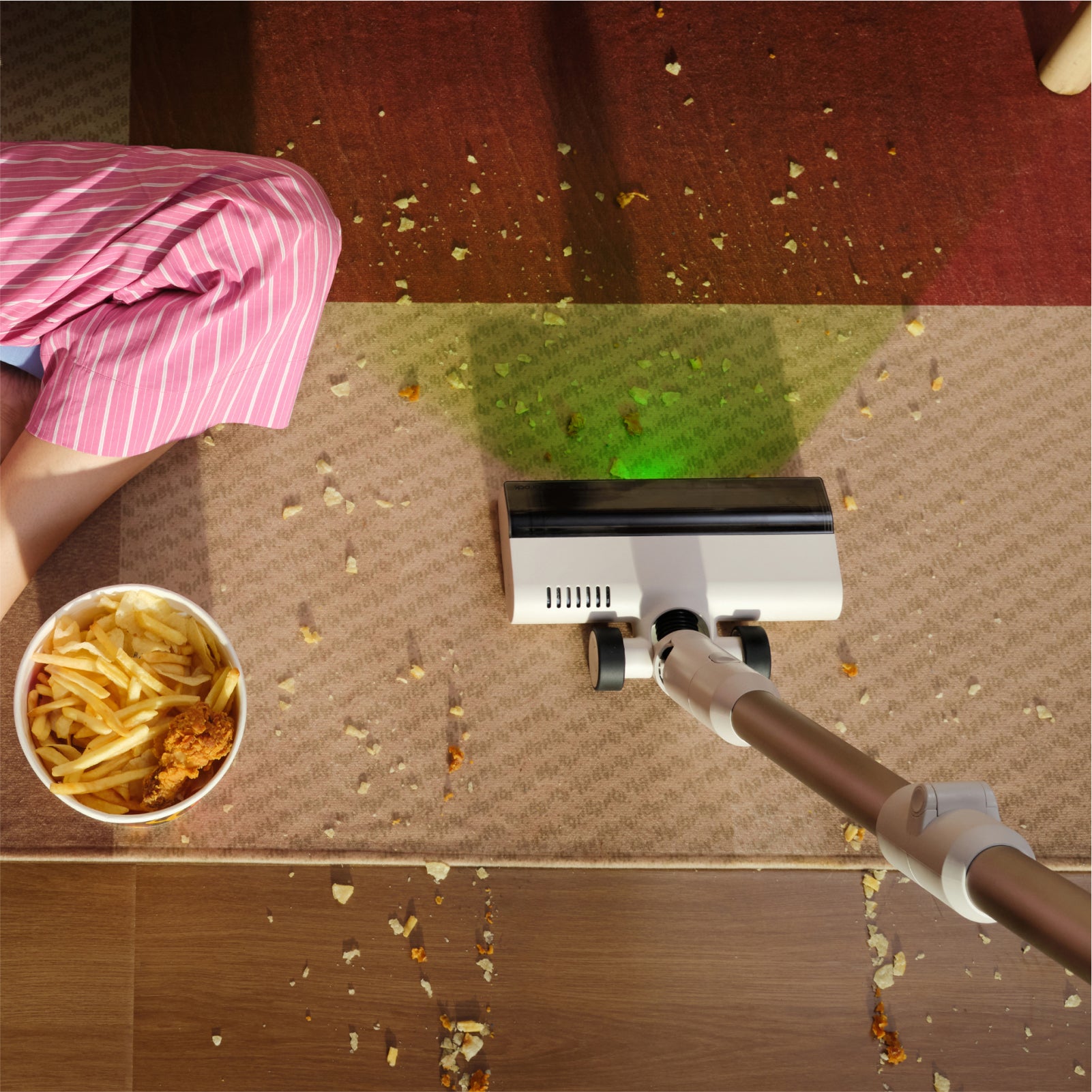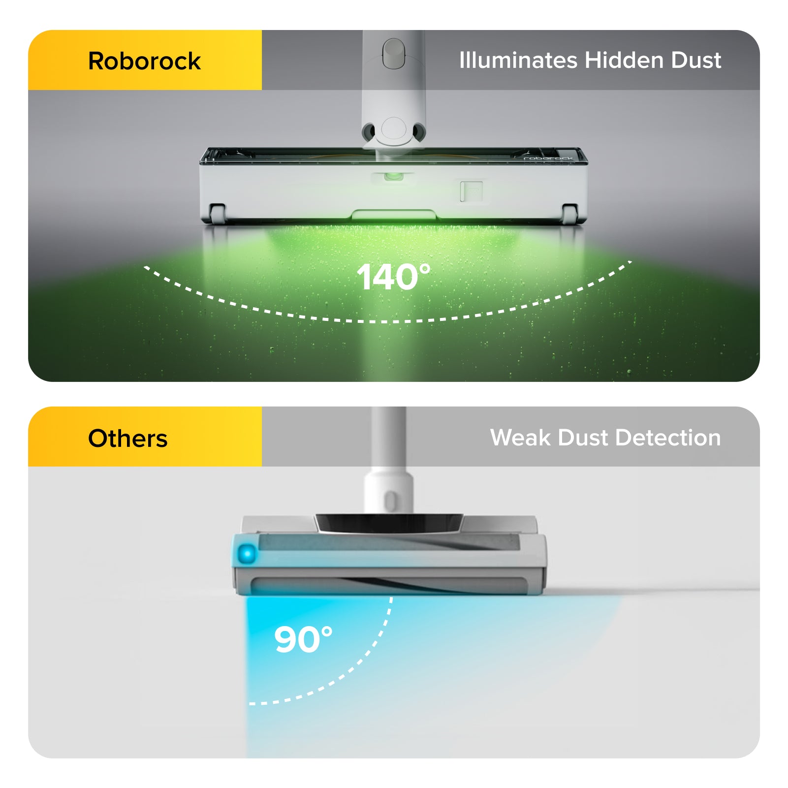 A powerful green light exposes invisible dust and fine particles, while its 140° ultra-wide angle and central alignment ensure maximum floor coverage for a deeper clean.