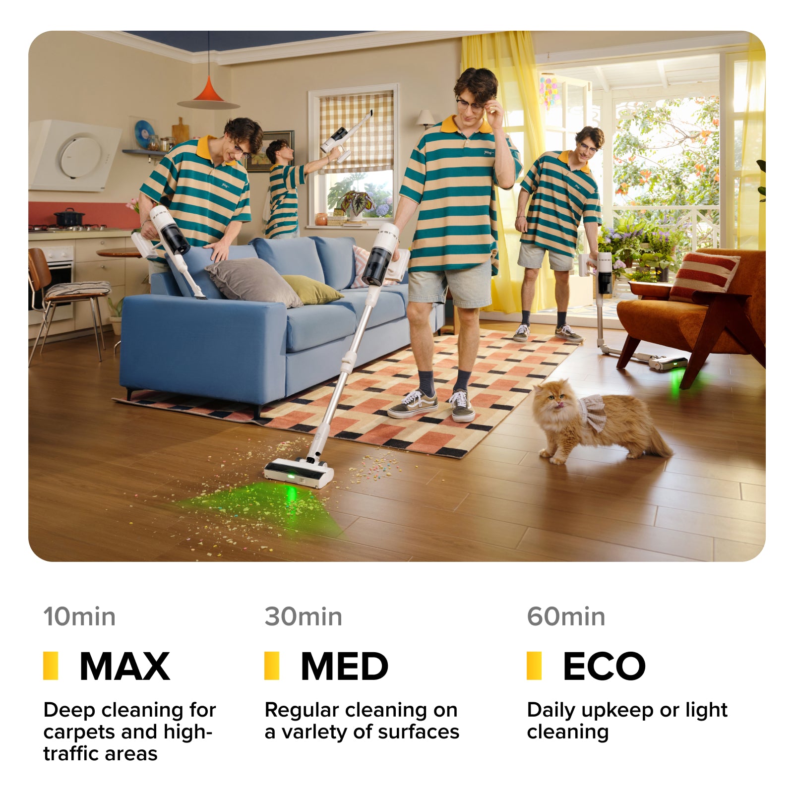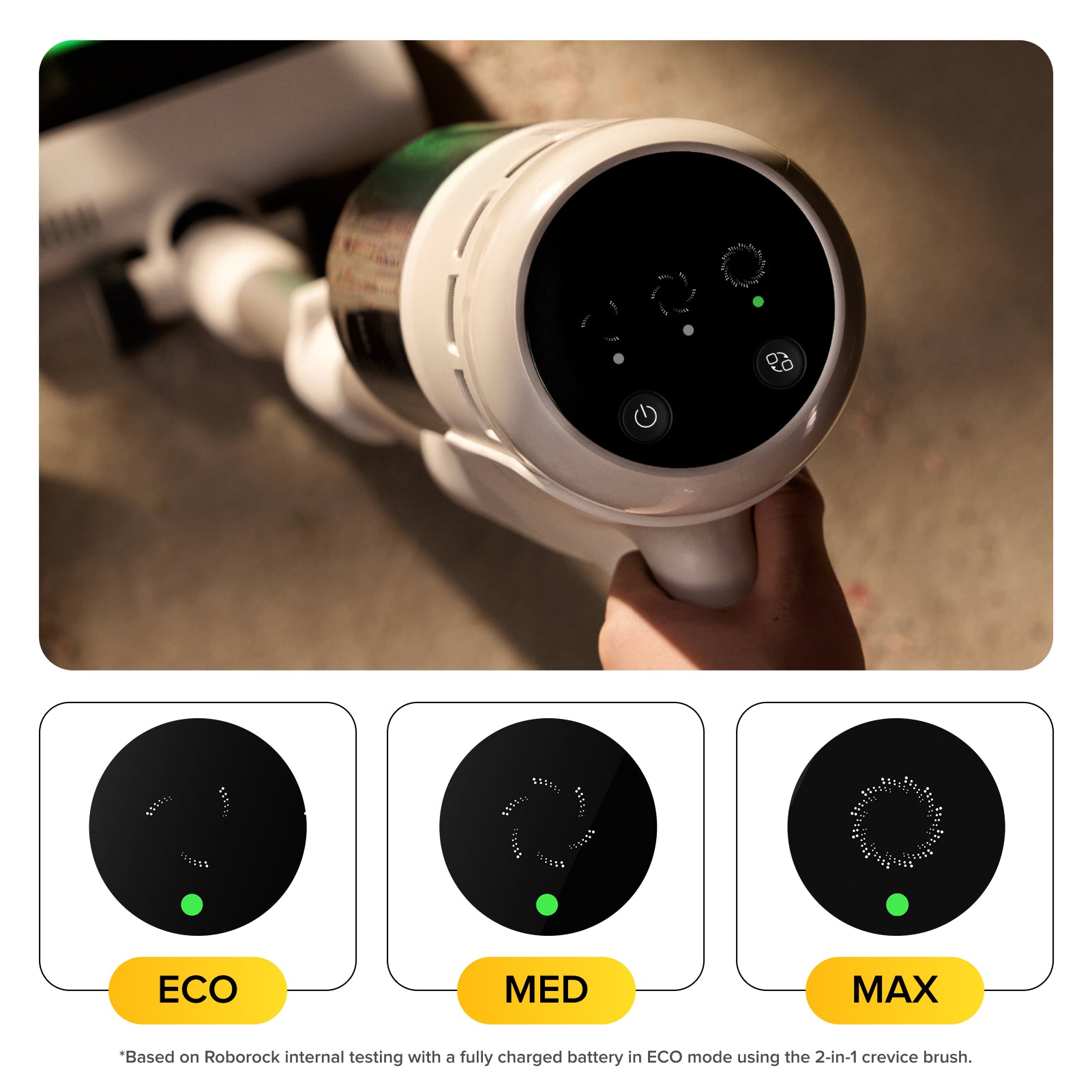 Whether it’s everyday dust, routine cleaning, or deep dirt in carpets, Roborock H60 adapts to your needs with three customizable power modes. Switch effortlessly between ECO, MED, and MAX to balance performance and battery life, delivering just the right amount of power exactly where it’s needed.