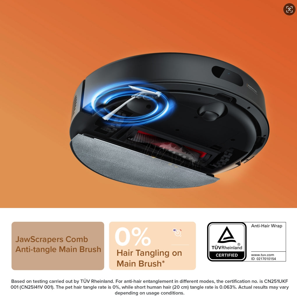 Experience powerful cleaning with 10,000 Pa HyperForce suction for deep dirt removal. The Dual Anti-Tangle System prevents hair clogs, while VibraRise® 2.0 Mopping scrubs away stubborn stains. PreciSense™ LiDAR ensures accurate mapping, and Reactive Tech helps the robot smoothly avoid obstacles.