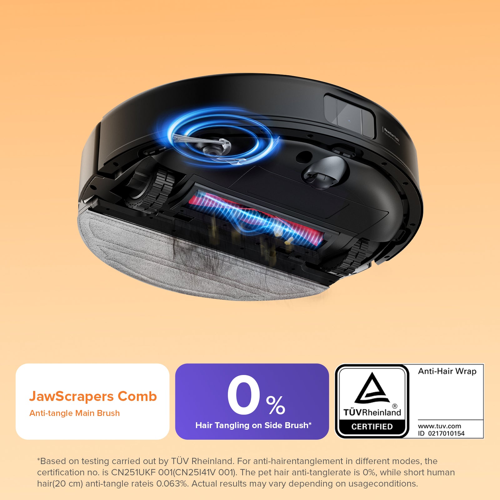 The high-suction fan on Q10 X5/Q10 X5+ boasts a 95% hair pickup rate. The system consists of a JawScrapers comb anti-tangle main brush and anti-tangle side brush, ensuring minimal hair entanglement. All brushes have been tested and certified by TÜV Rheinland for anti-entanglement. The all-new Dual Anti-Tangle System eliminates hair tangles for good.