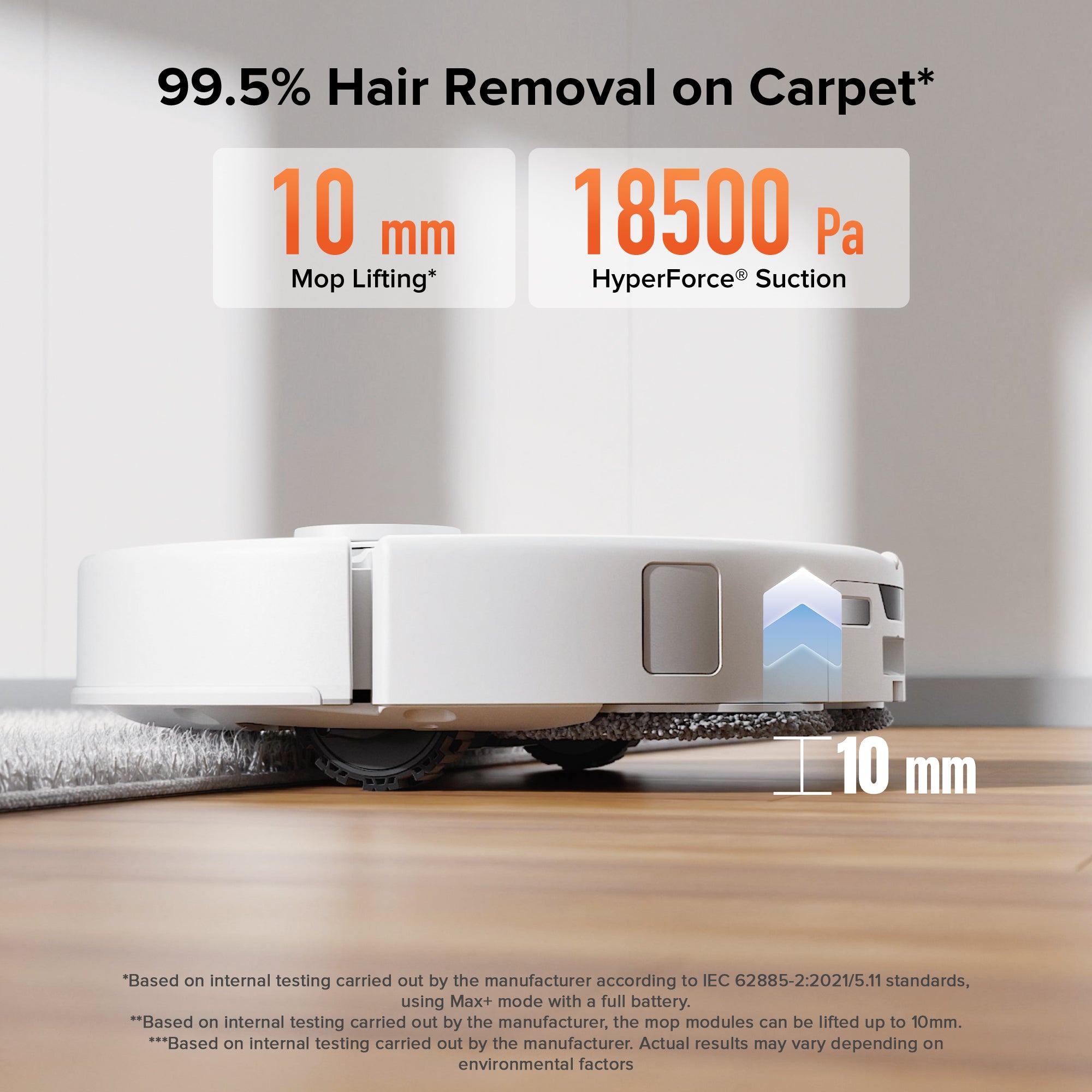 With automatic mop lifting over carpets, enjoy the freedom to move seamlessly between floors and carpets while preventing carpets from getting stained. Meanwhile, 18,500 Pa HyperForce® Suction* ensures 99.5% hair removal on carpets.