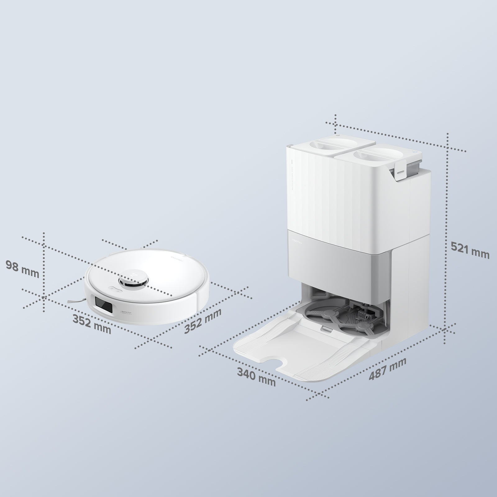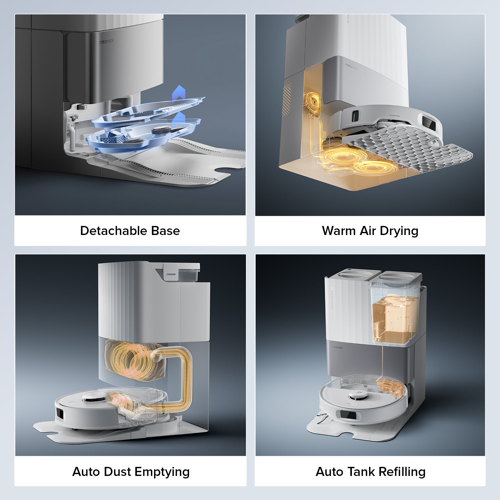 6. Multifunctional dock with 75°C hot-water mop washing, auto-refilling of the onboard water tank, dustbin auto-emptying, and warm-air drying for the mop cloths.