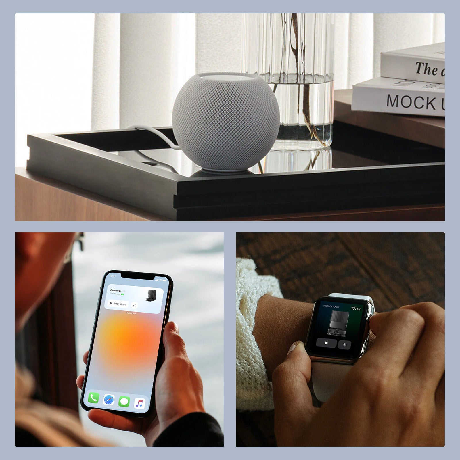 Voice commands via Amazon Alexa, Apple Siri Shortcuts, or Google Home.