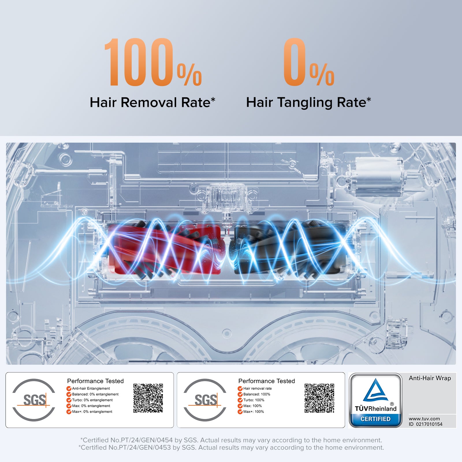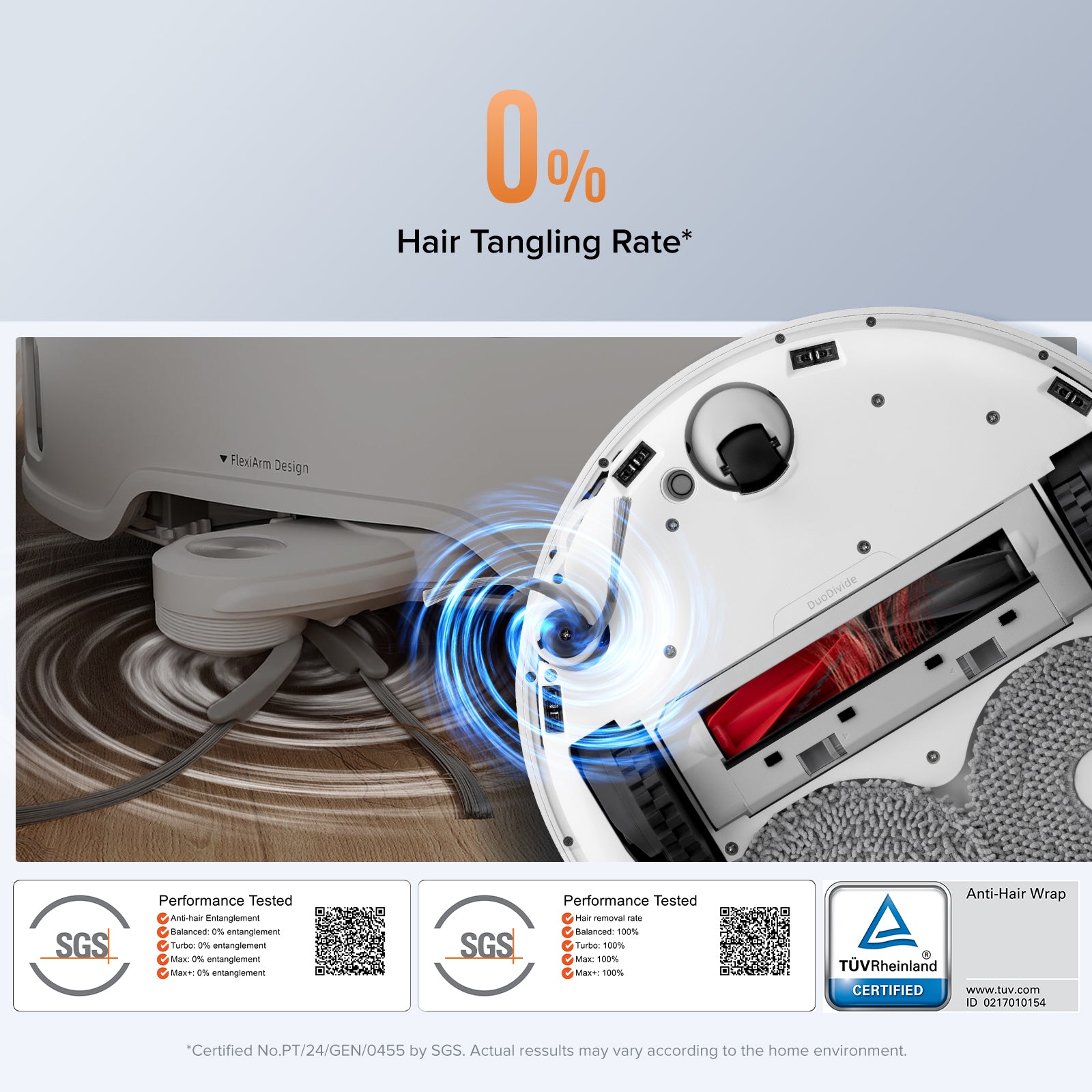 A:  The DuoDivde brush is certified by SGS with 0% hair entanglement rate and 100% hair removal rate. It solves the problem of decreased cleaning efficiency caused by hair entanglement on the main brush and reduces the risk of main brush damage due to hair entanglement, making the robot vacuum cleaner more durable.