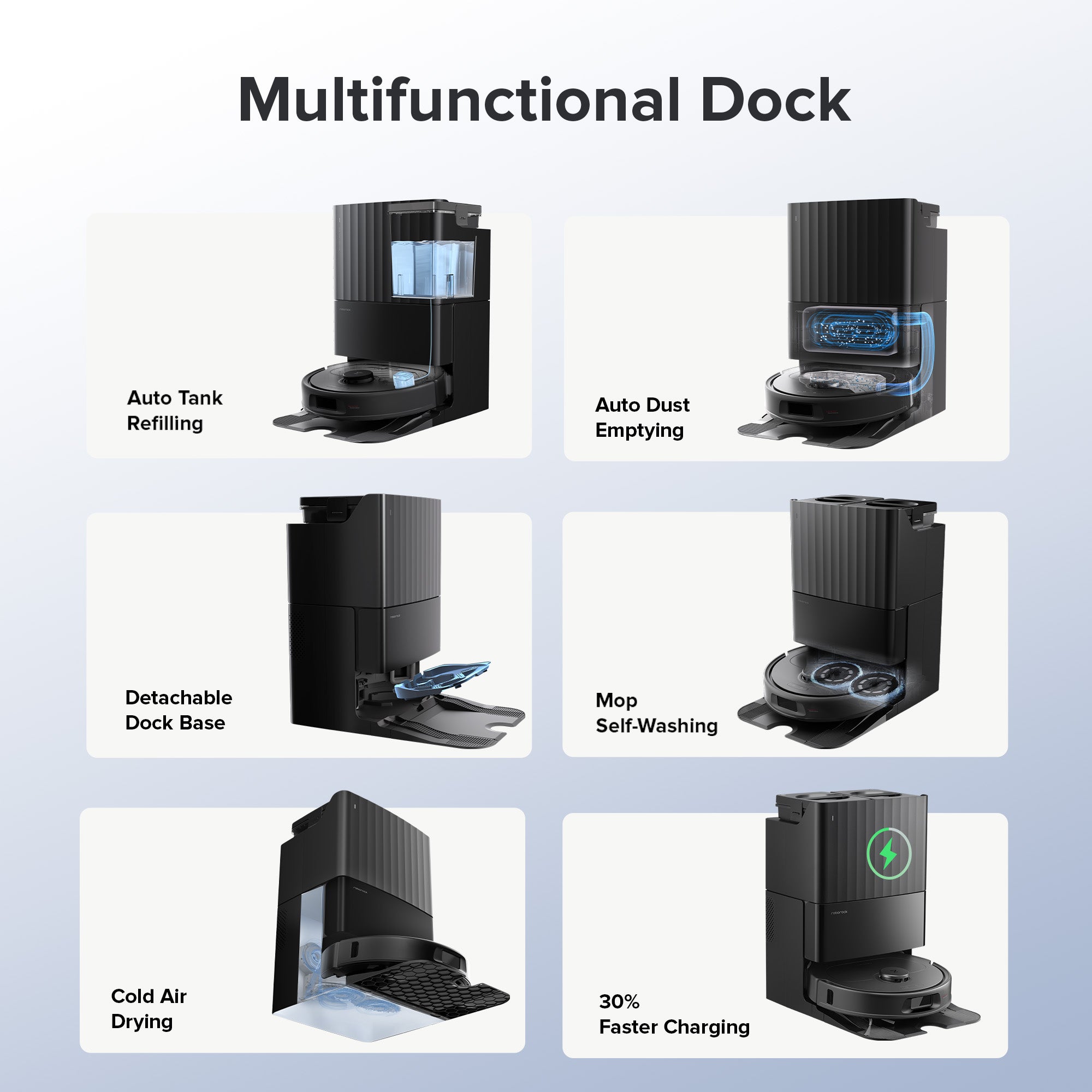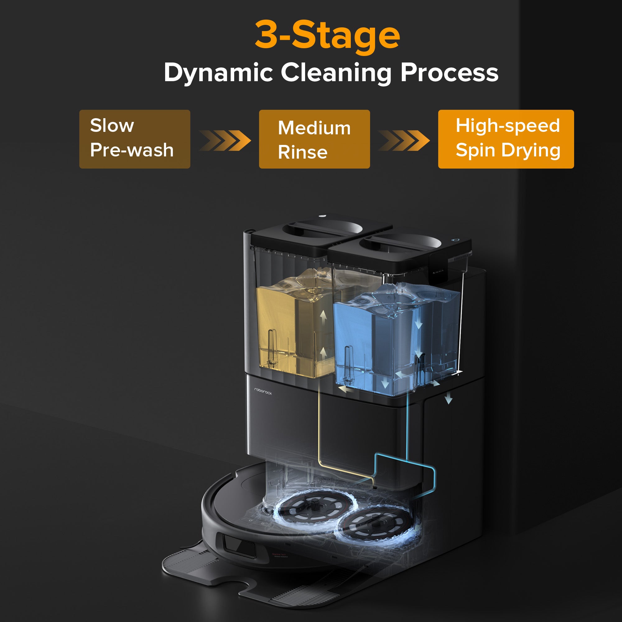 Featuring a 3-stage dynamic cleaning process to wash and dry the mops with high efficiency and convenience.
