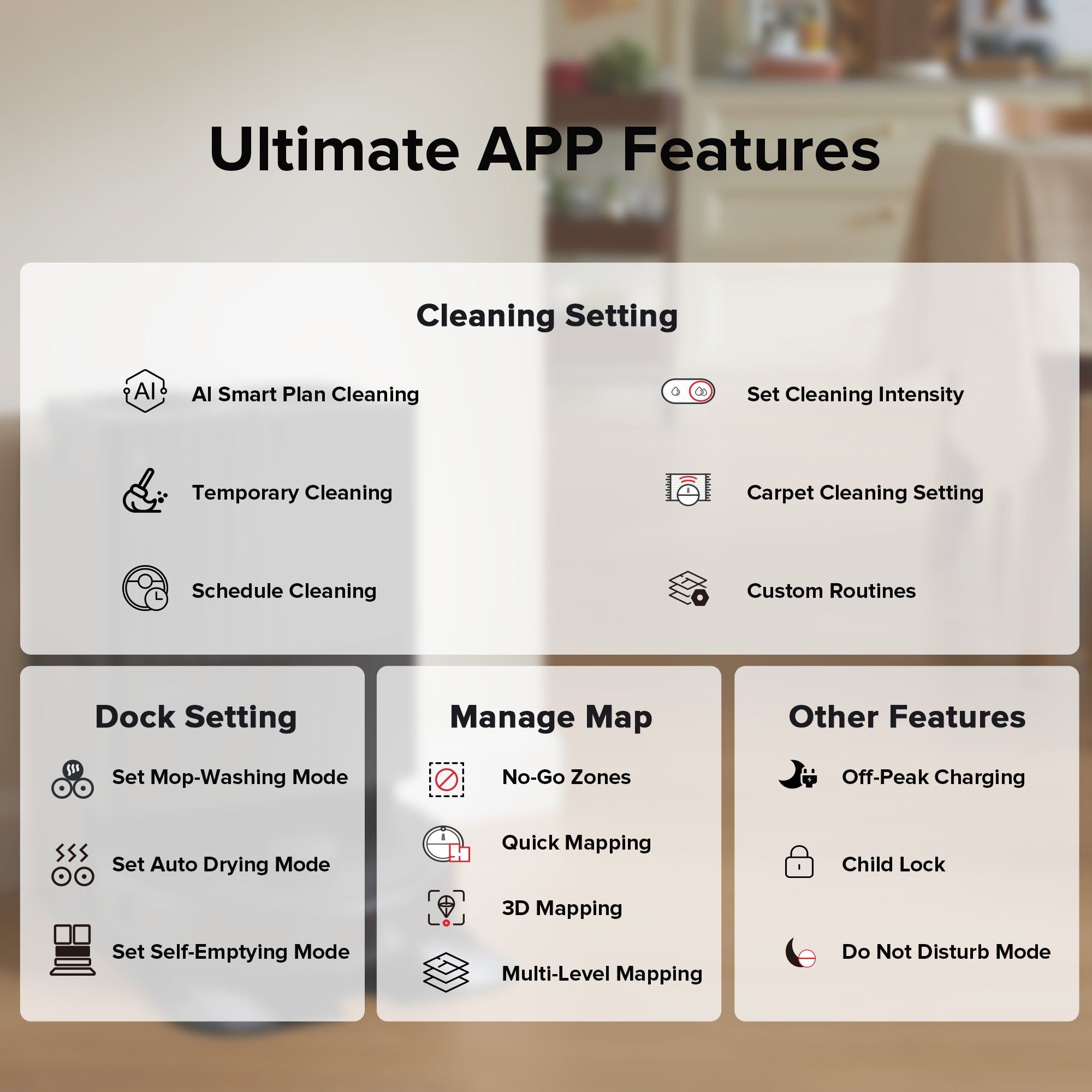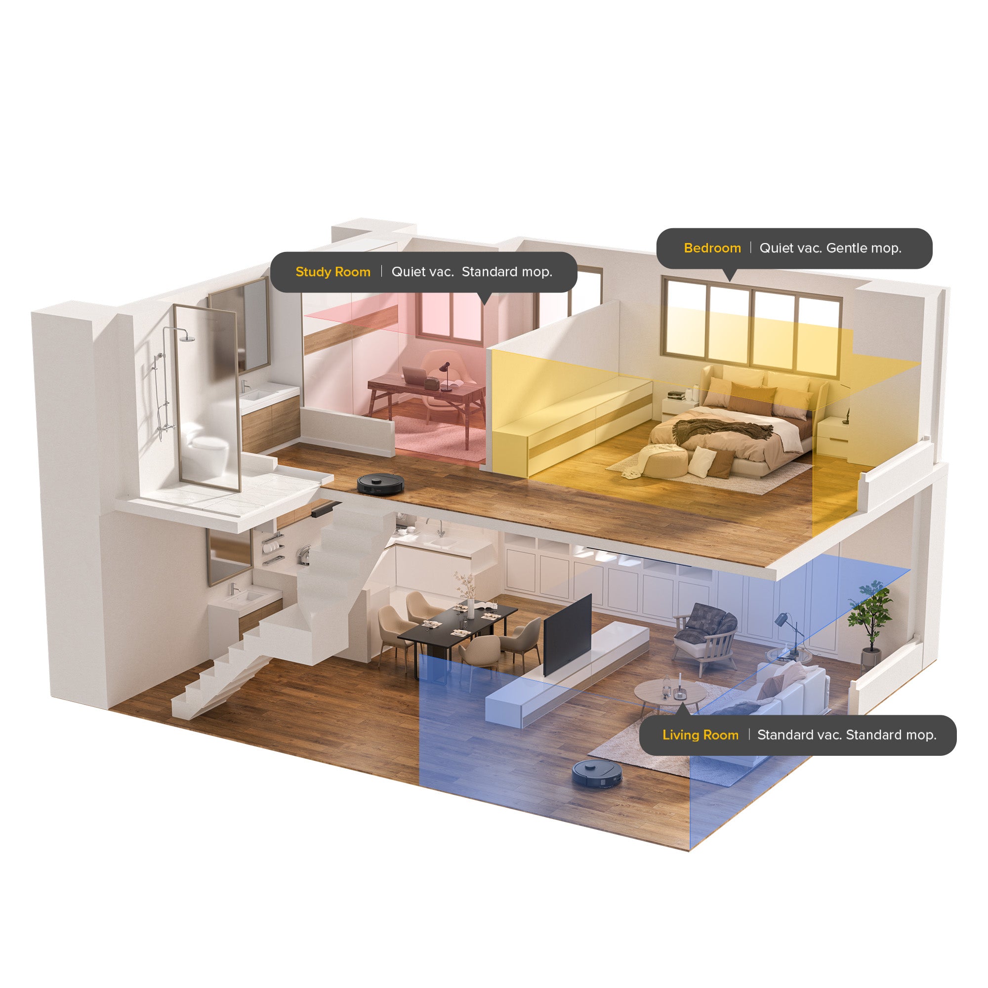 Setting the room and floor type in the Roborock App, the robot vacuum will be tailored to your home with different water flow and suction power for the perfect clean.