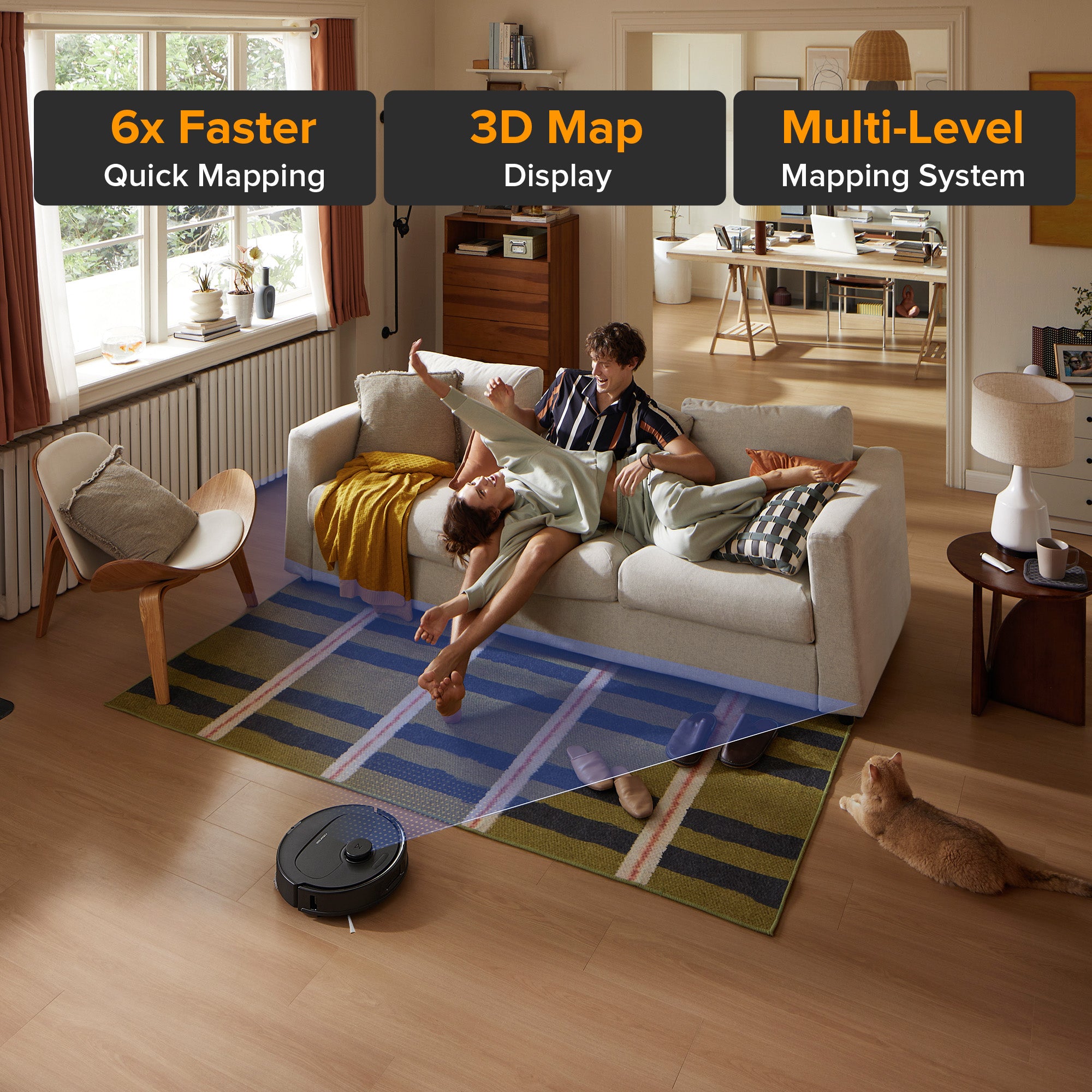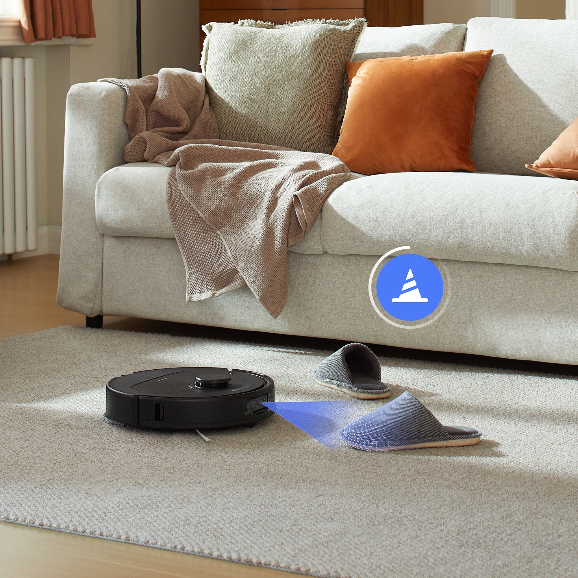 Powered by structured light, it is ready to detect and navigate around obstacles effortlessly, even in cluttered rooms with items scattered on the floor.
