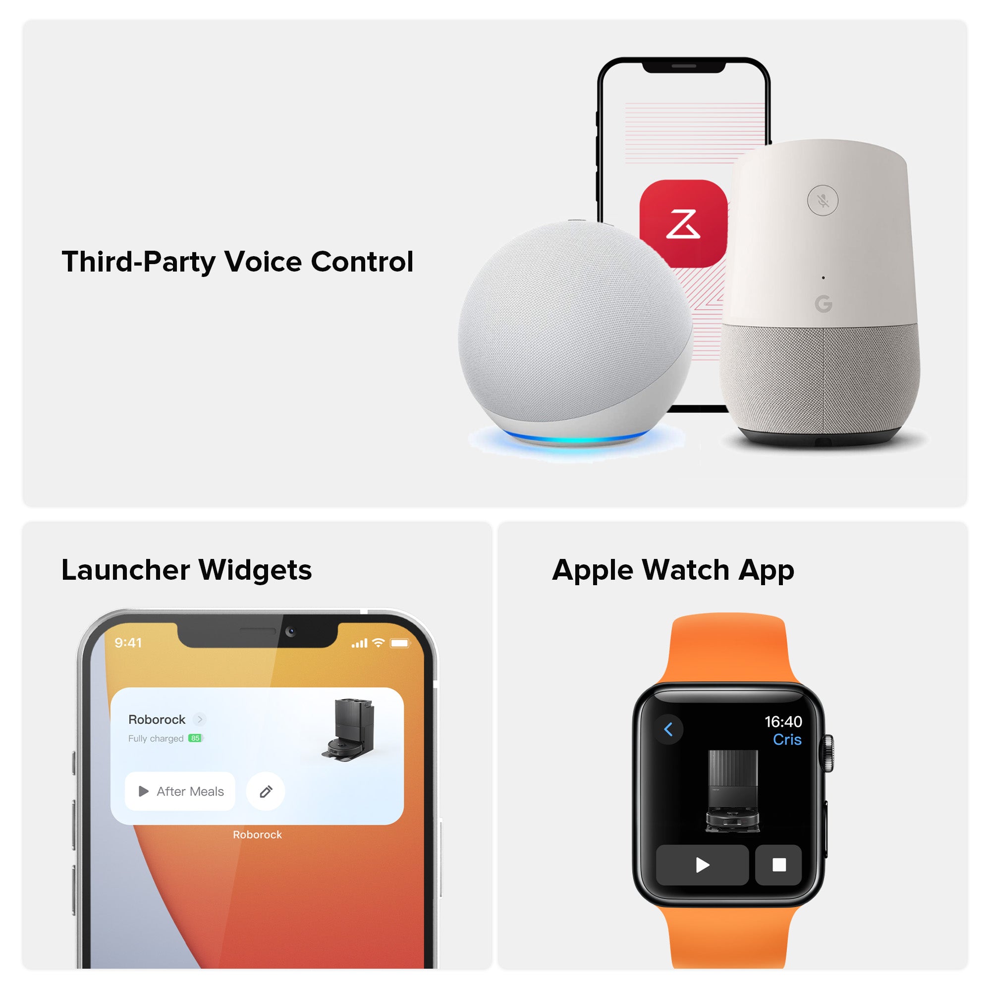 Voice commands via Amazon Alexa, Apple Siri Shortcuts, or Google Home.