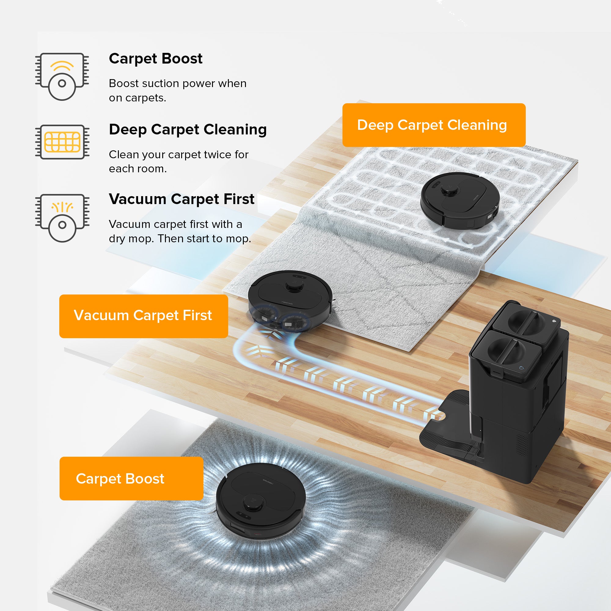 Customize your carpet cleaning strategies on the Roborock APP according to carpet type and personal needs.