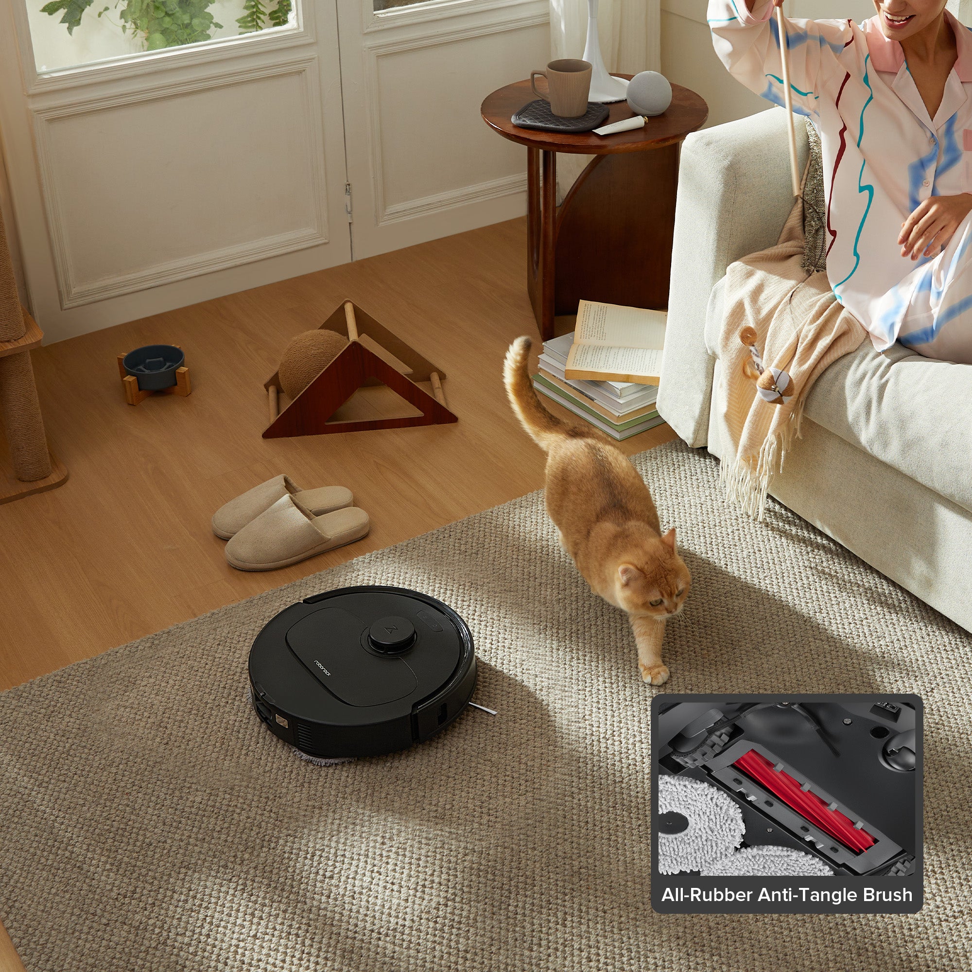 The spiral-designed rubber floating main brush and arc-shaped asymmetric side brush effectively remove hair for optimal and hand-free cleaning.