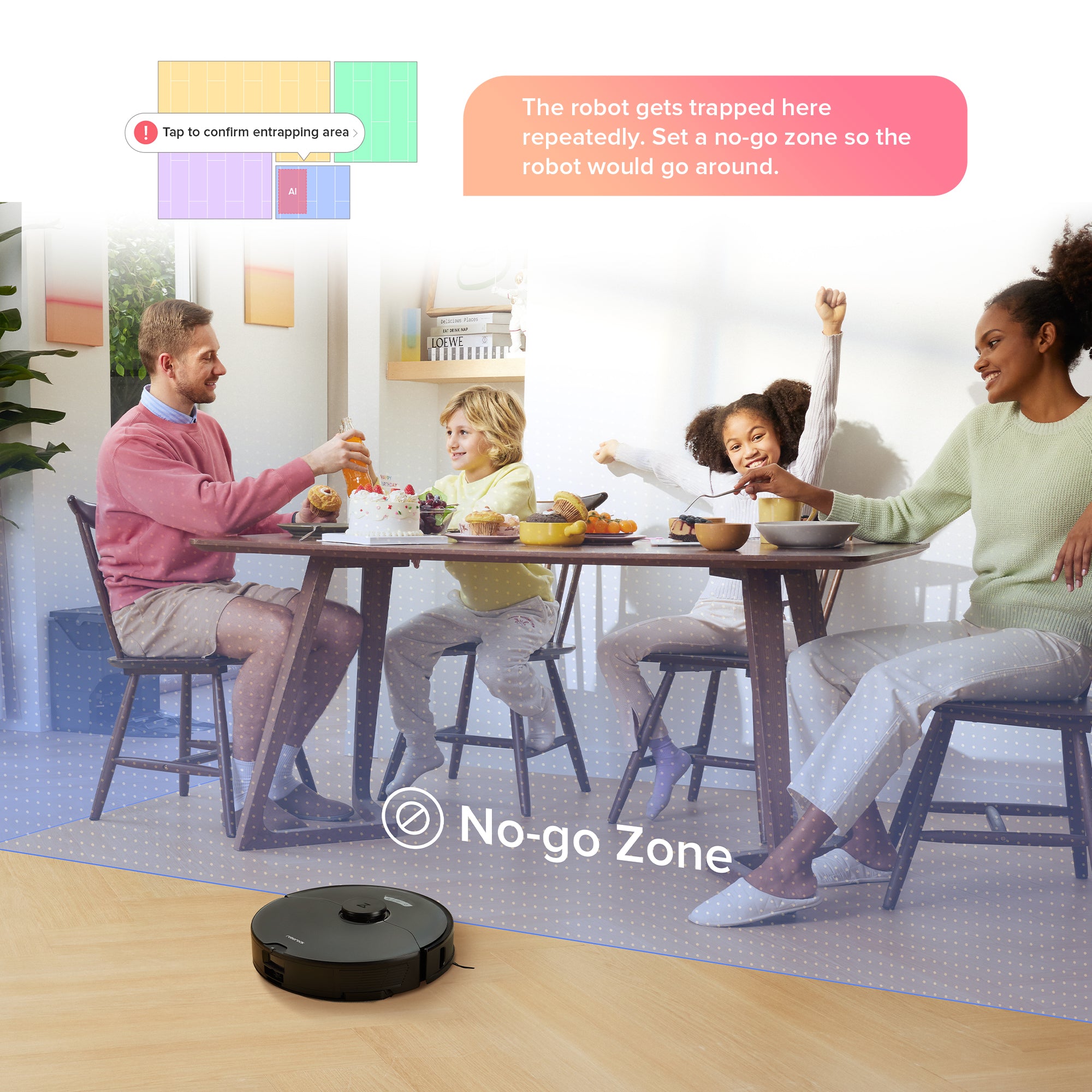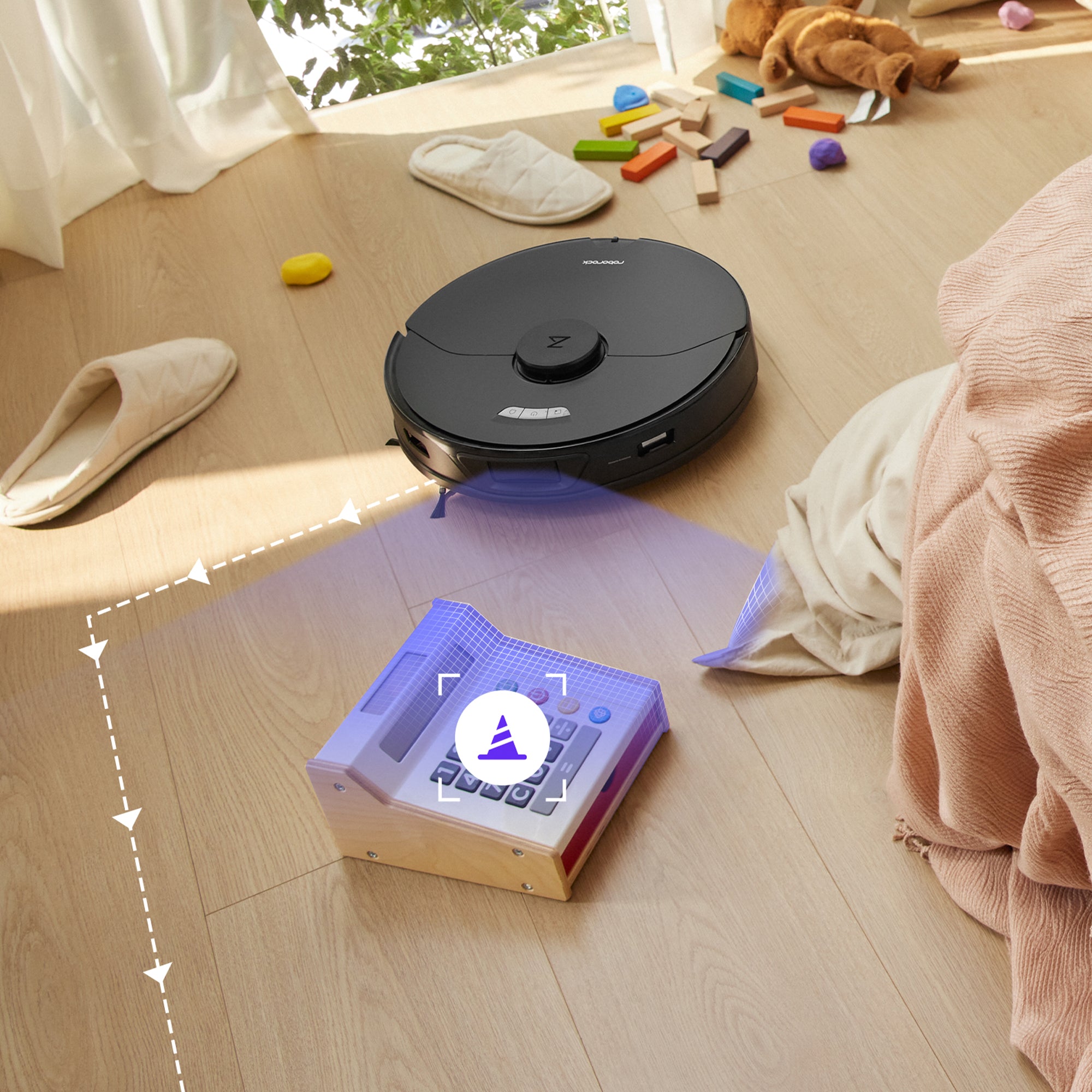 Detects objects on the floor so you don't have to move anything before starting a clean-up. It can also suggest No-Go Zones automatically, to prevent your robot vacuum getting stuck in tight spots, or falling down the stairs accidentally.
