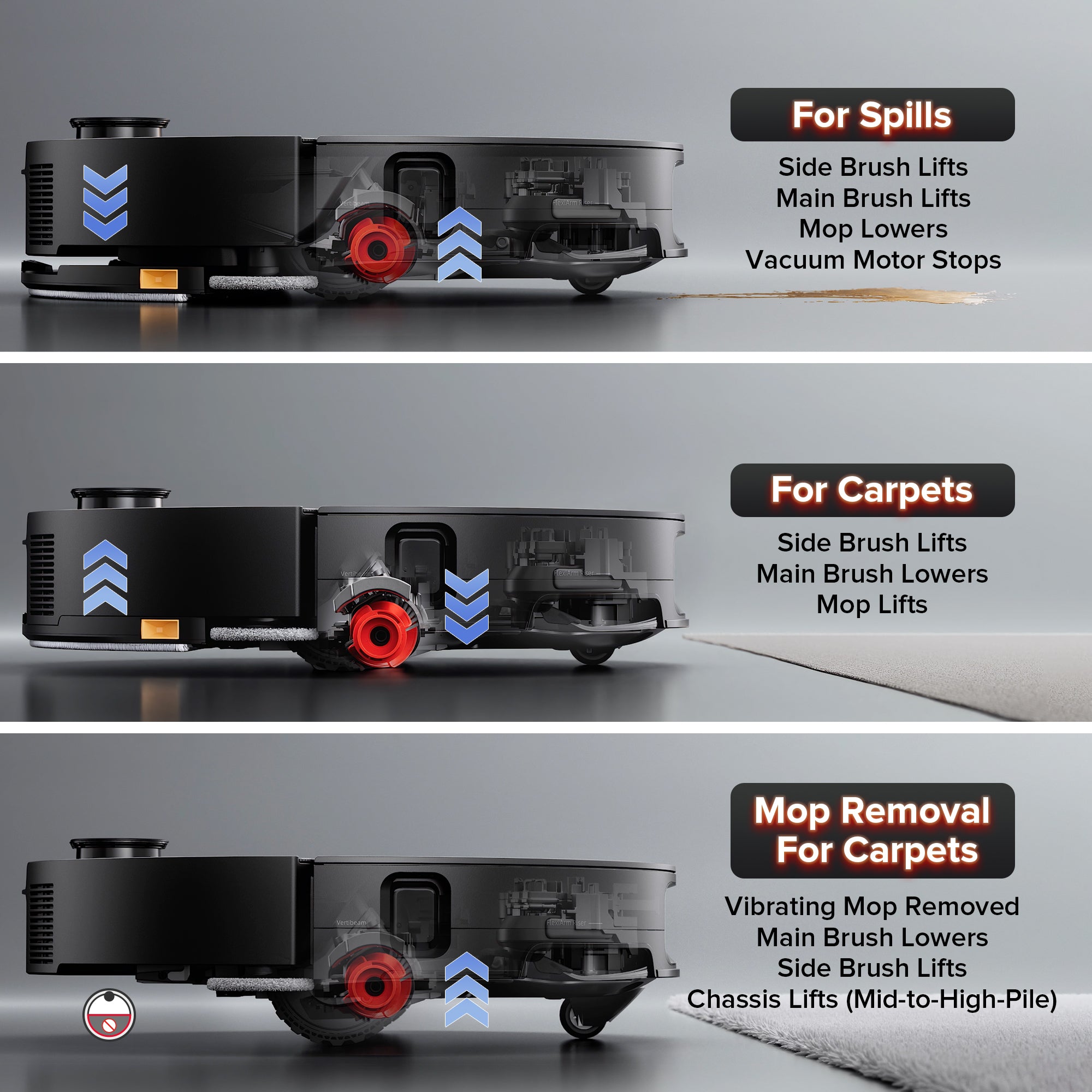 Adaptive dry-wet separation for precise cleaning: the side brush, main brush, and dustbin stay dry, while the mop avoids carpet to prevent any risk of re-wetting.