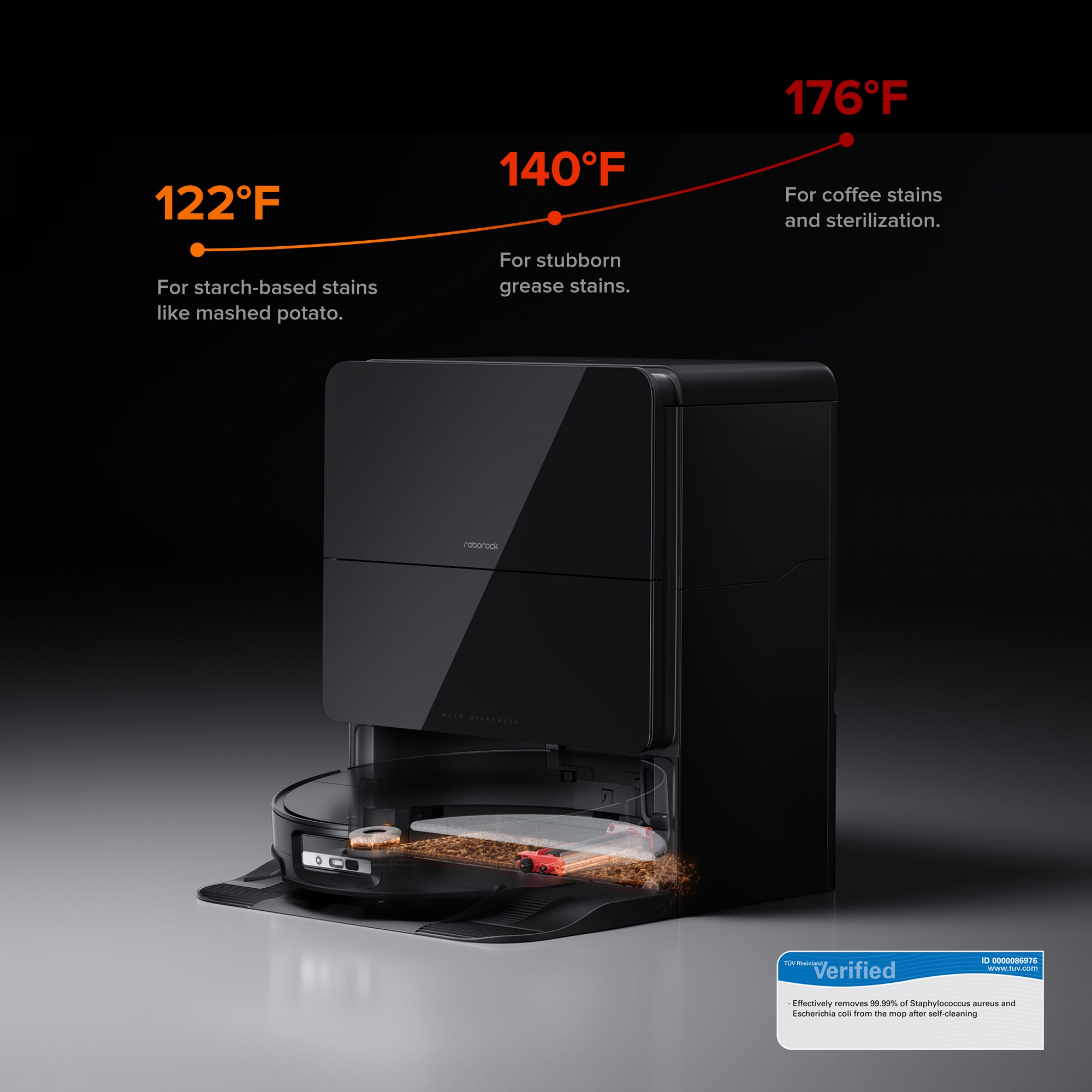 The RockDock® Ultra 2.0 uses adaptive water temperatures to tackle stains, preventing starch-based stickiness, melting oil stains, and sterilizing at high temperatures to remove 99.99% of Staphylococcus aureus and Escherichia coli from the mop after self-cleaning.*