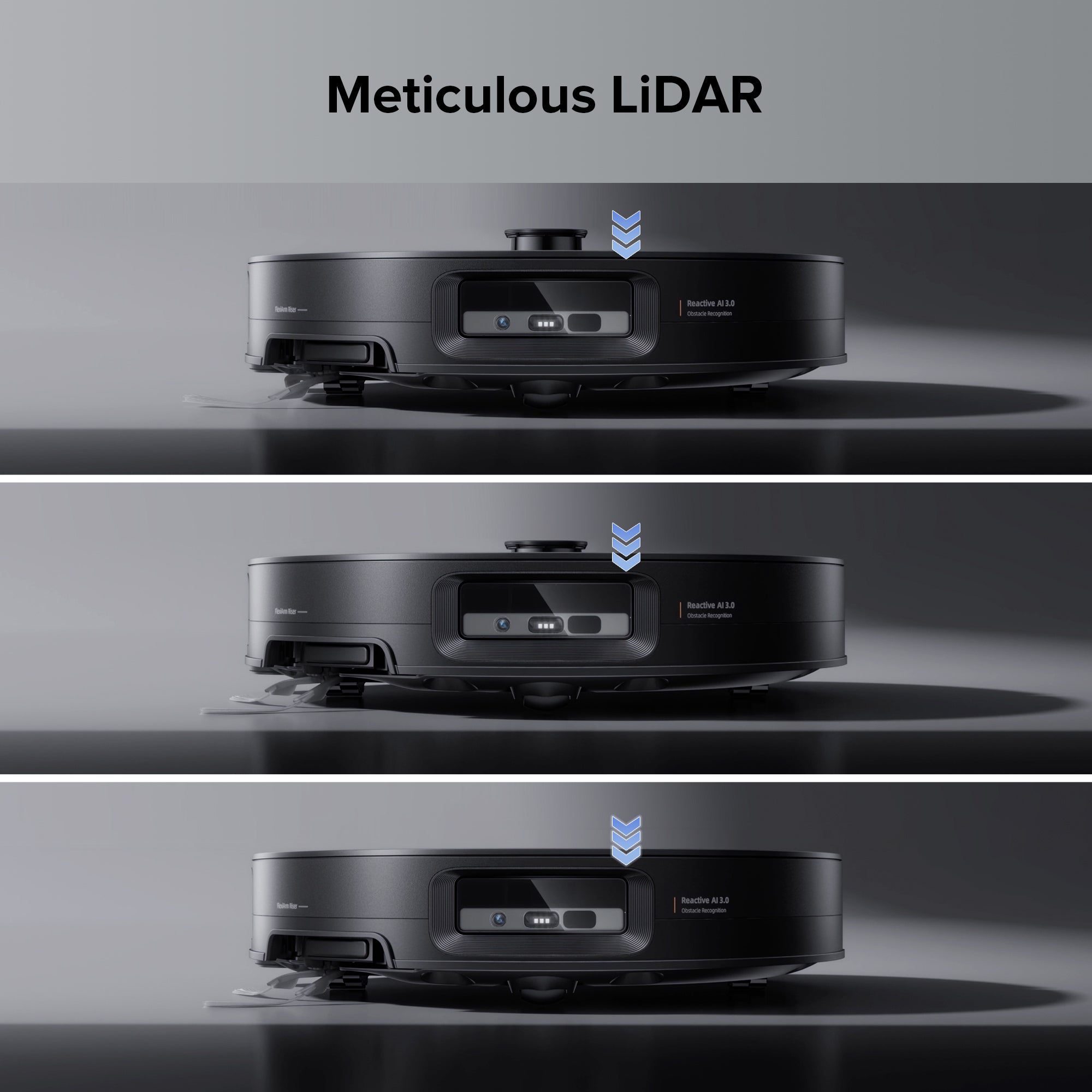 The Upward Range Finder adjusts the LDS height for smooth mapping through low-clearance areas, while the Top Contact Sensor prevents forced entry and surface scratches by detecting obstacles in real time.