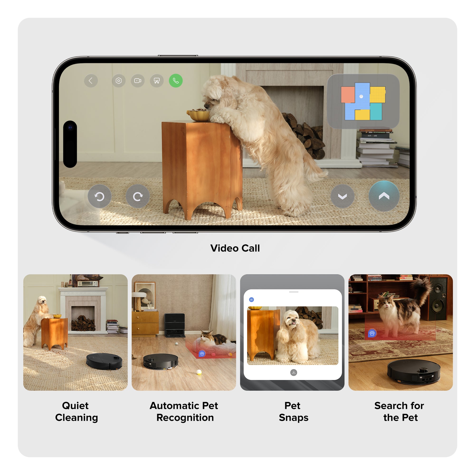 The video call feature, quiet cleaning mode, automatic pet recognition, pet snaps, and search for the pet function all work together to enhance your home cleaning and pet care experience.